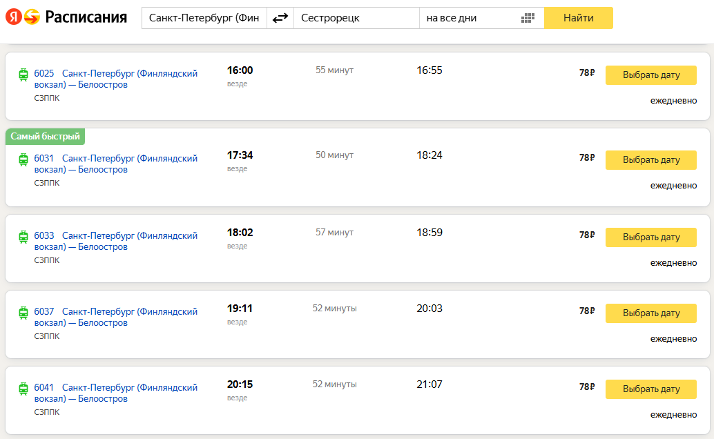 29 ноября на сайте РЖД в графике на 16 декабря в сторону Сестрорецка значилась электричка с отправлением в 19:02 от Старой Деревни