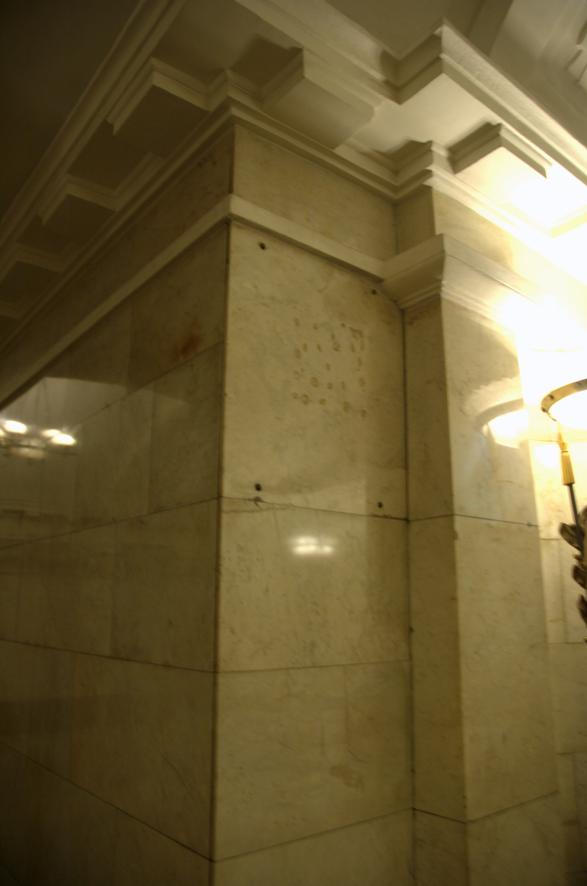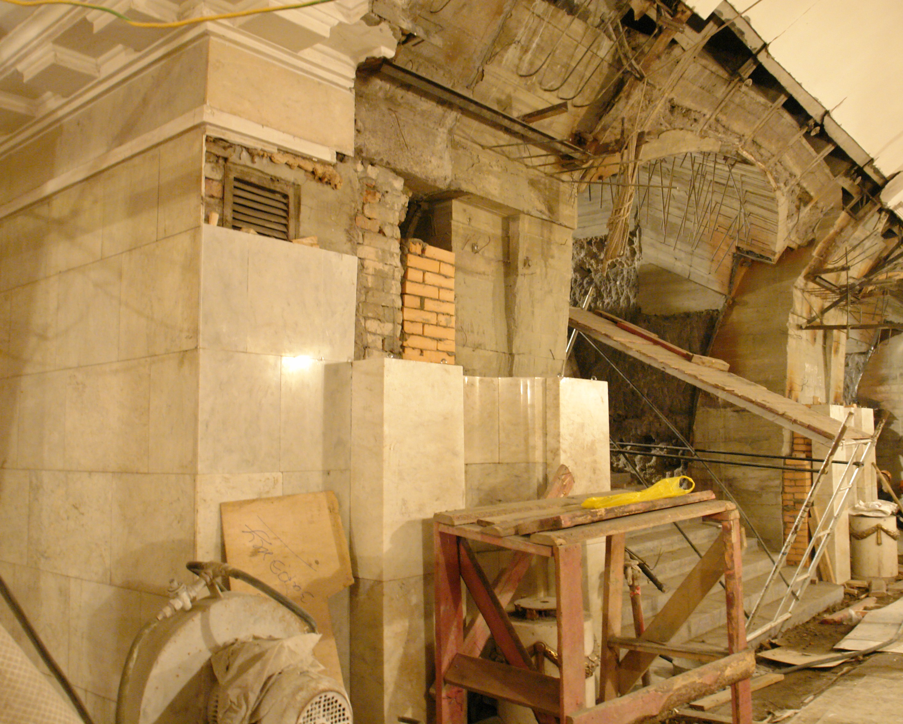 Плитки имеют большой размер и приличный вес. За ними остались первоначально сооруженные вентканалы, от которых впоследствии по каким-то причинам отказались (за камнем даже металлические жалюзийные решётки остались). Из-за того, что плитки закрыли вентиляционные проёмы, - под ними осталась пустота и возникла необходимость обеспечить дополнительную фиксацию камня. Поэтому ещё до пуска станции в эксплуатацию было принято решение об усилении крепления всех плиток в среднем зале станции, что мы и можем с Вами сейчас наблюдать.
