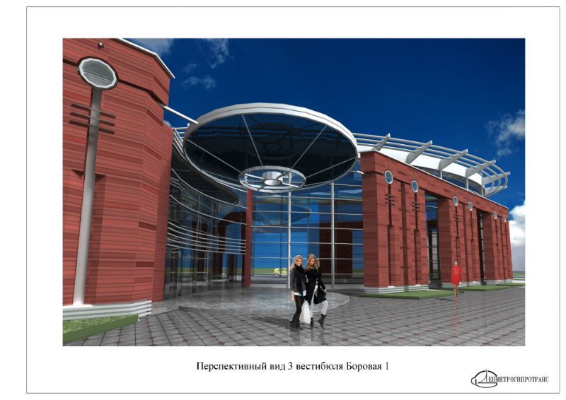 Следующая станция – «Боровая». По проекту, у нее будет два выхода и отдельно стоящих вестибюля. Так, вестибюль «Боровая-1» возведут рядом с одноименной железнодорожной станцией Витебского направления, «Боровая-2» – на пересечении Лиговского проспекта и улиц Тосина. Учитывая, что это место не имеет особых достопримечательностей, в «Ленметрогипротрансе» просто решили выполнить архитектуру станции в современном стиле, без какой-либо четкой тематической привязки.
