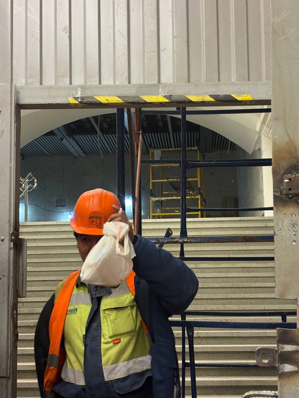 В вестибюле Путиловской завершили монтаж потолка (так называемой «кубота») под антаблементом здания, завершают монтаж куботы и установку освещения в служебной части вестибюля.