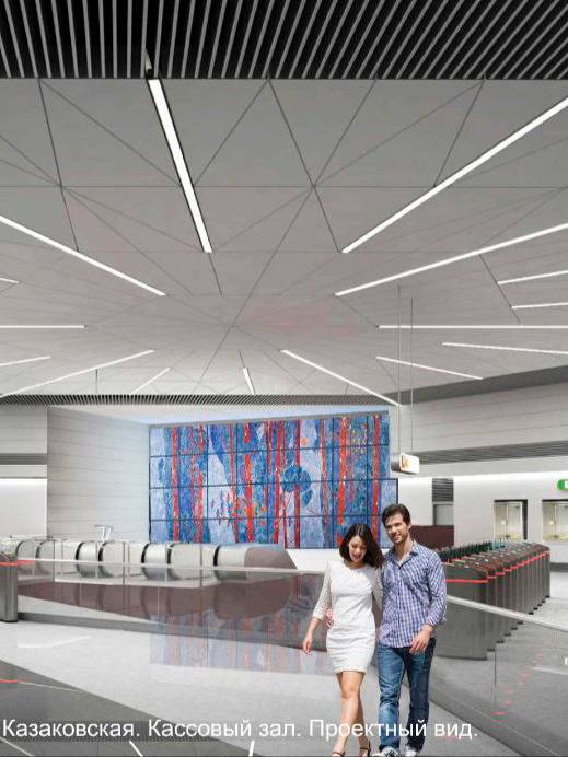 В кассовом зале вестибюля станции «Казаковская» строительства Красносельско-Калининской линии Петербургского метрополитена начался монтаж панно над эскалаторами.