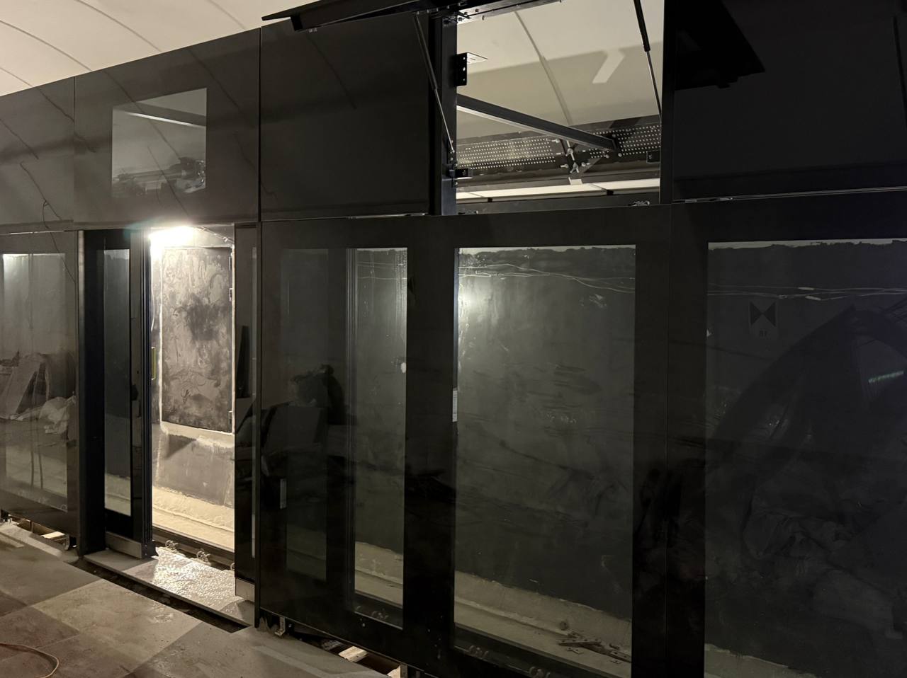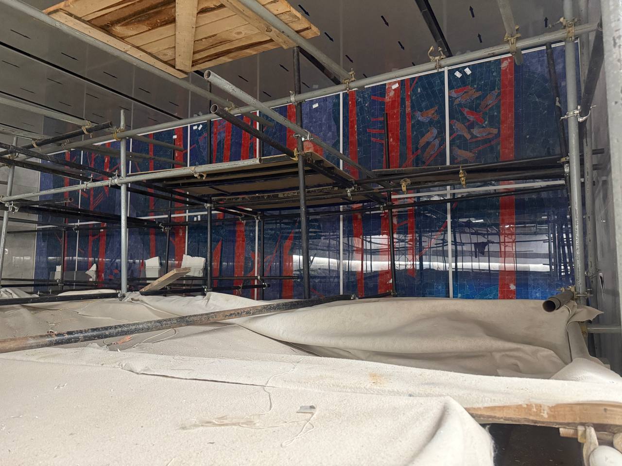 В кассовом зале вестибюля станции «Казаковская» строительства Красносельско-Калининской линии Петербургского метрополитена завершается монтаж панно над эскалаторами.