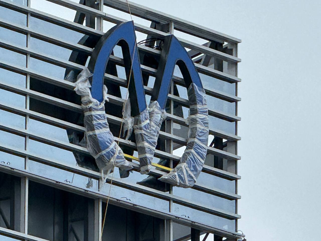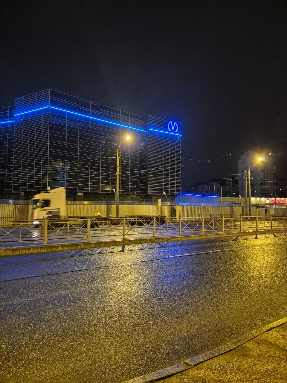 Также включена подсветка первого логотипа. Возможно, что расположение логотипов будет изменено, чтобы три логотипа были обращены на близлежащие транспортные артерии: 1 логотип должен быть обращён в сторону перекрёстка проспекта Маршала Жукова и улицы Маршала Казакова, 2 логотип - на запад, вдоль улицы Маршала Казакова, 3 логотип - в сторону пересечения проспекта Маршала Жукова и Ленинского проспекта.