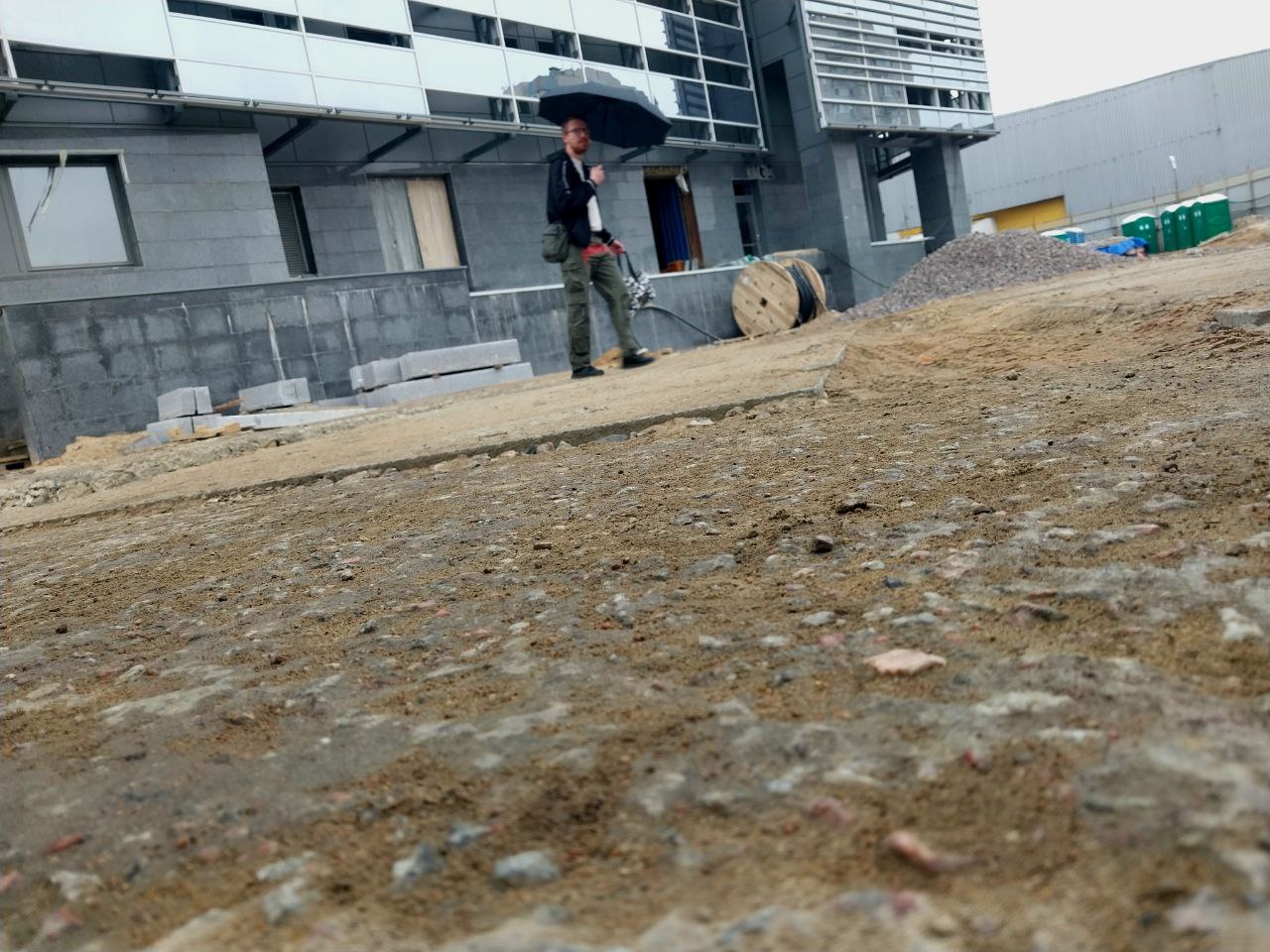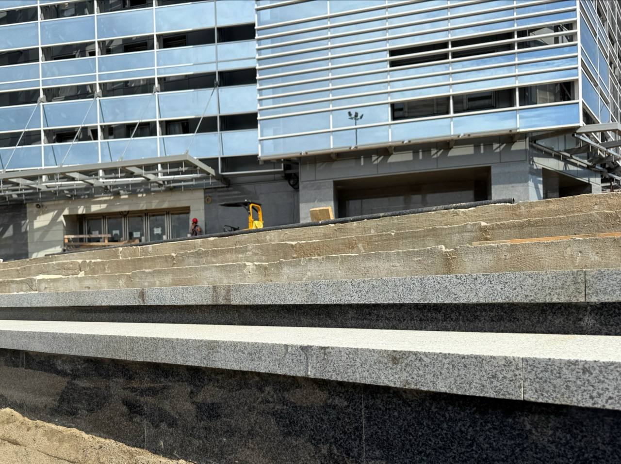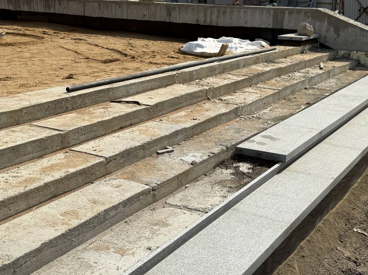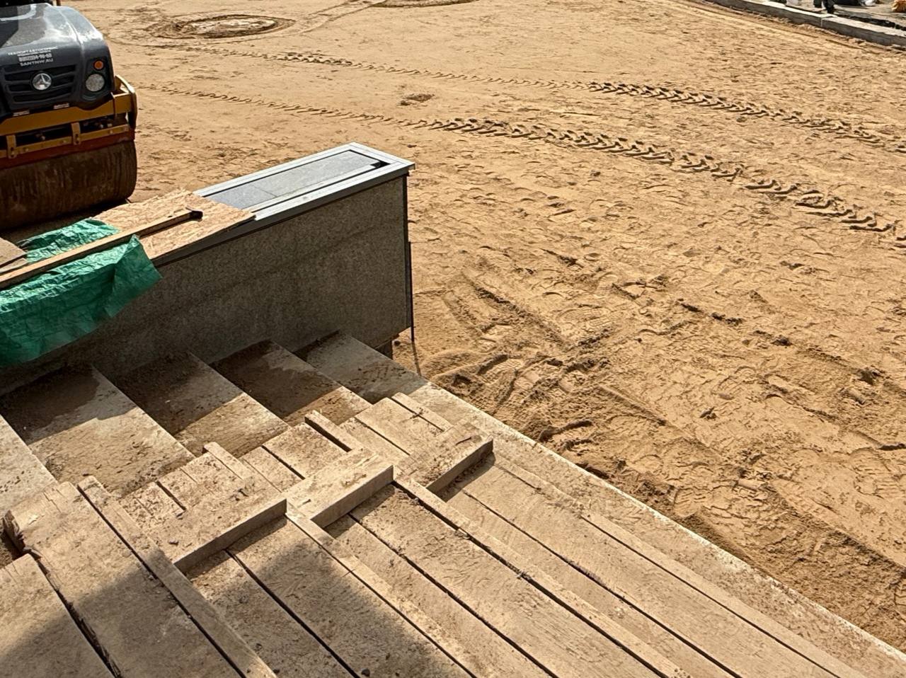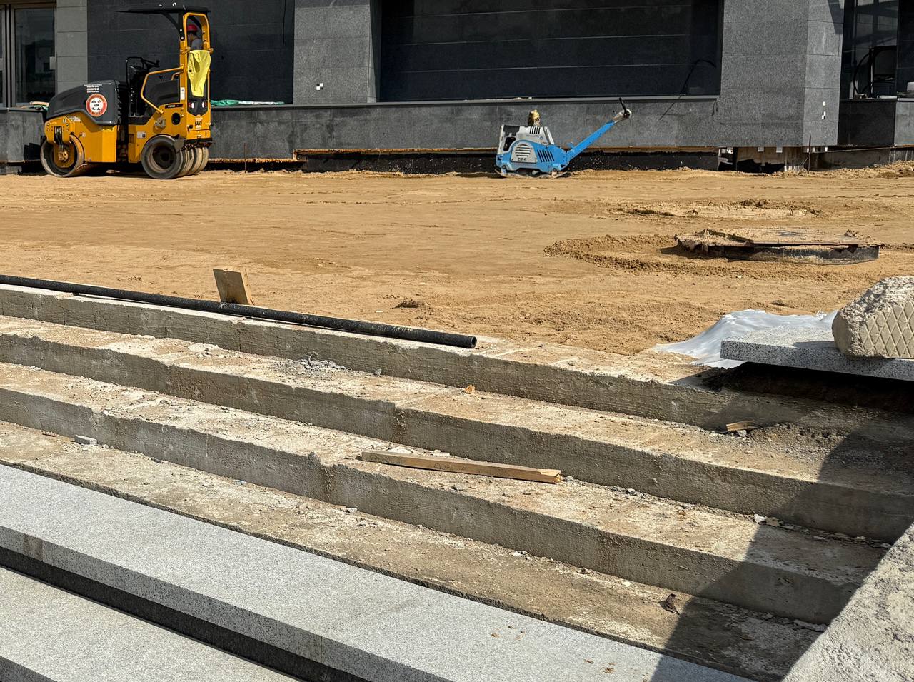 Идёт песчаная подготовка для мощения площади перед вестибюлем плитами из натурального камня. Также идёт облицовка гранитными плитами ступеней лестницы, по которой пассажиры будут подниматься к вестибюлю.