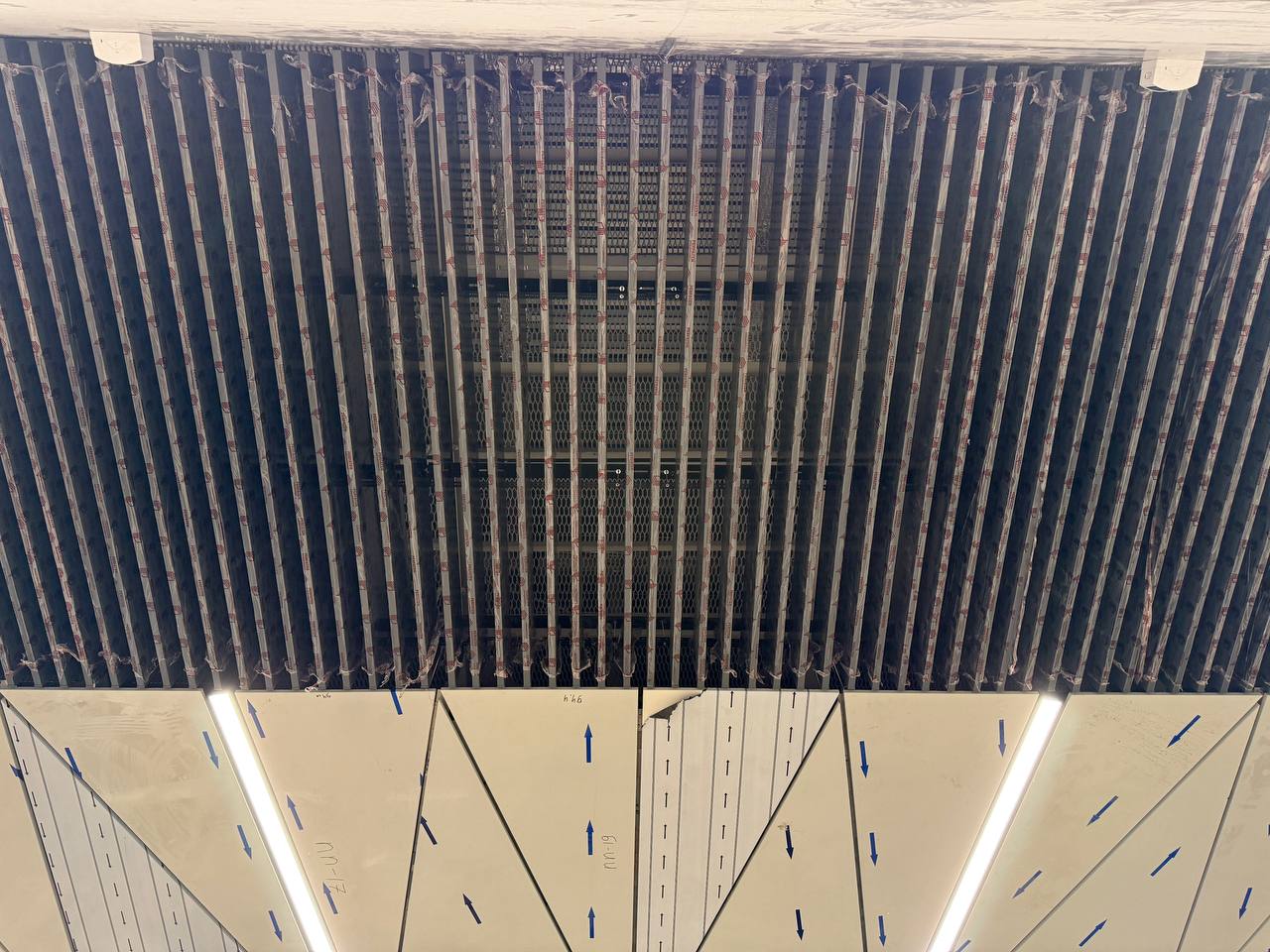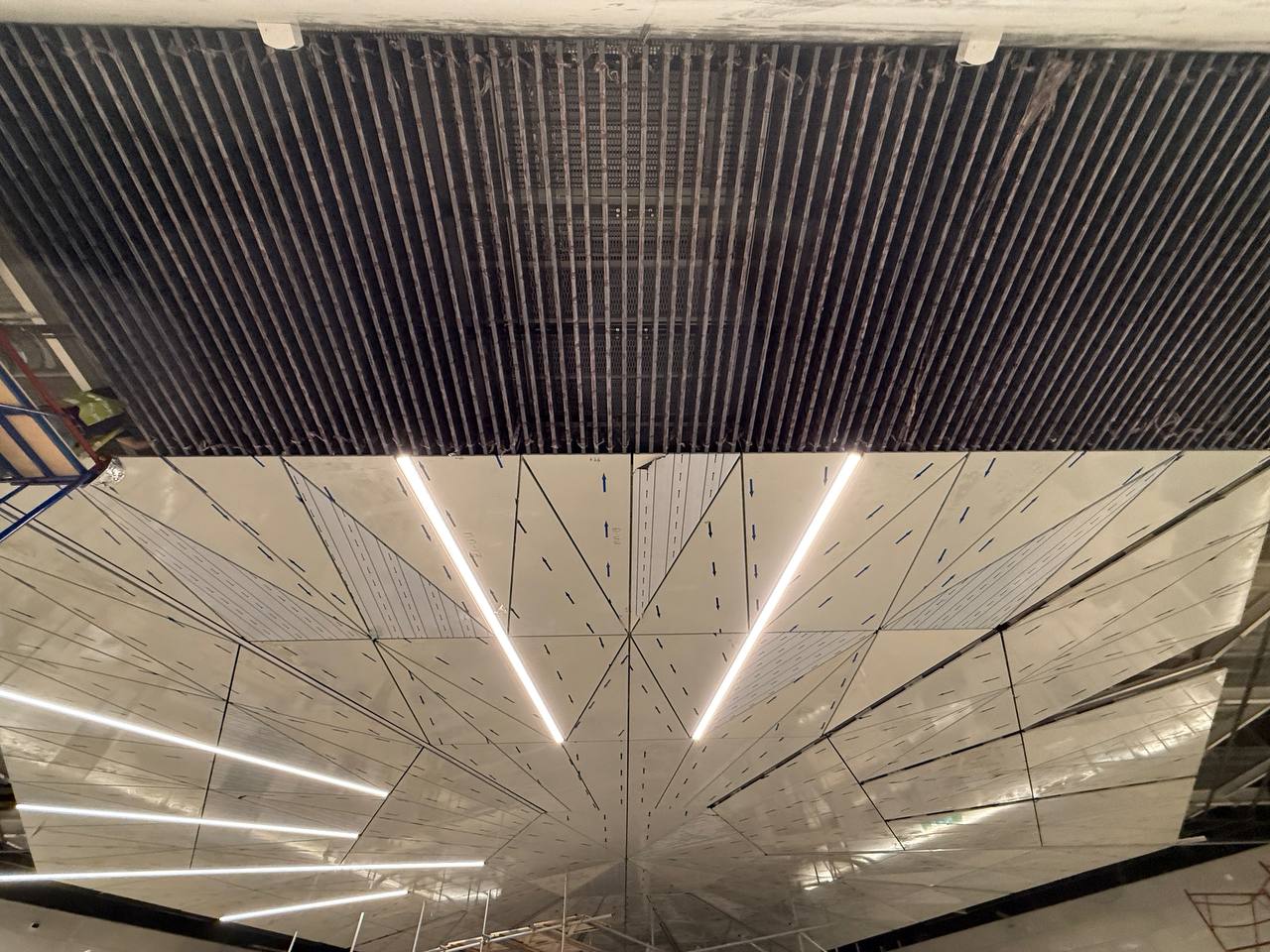 В кассовом зале вестибюля станции «Юго-Западная» строящейся Красносельско-Калининской линии Петербургского метрополитена завершается монтаж потолочных панелей. На смонтированную подсистему направляющих, закреплённых на фермах перекрытия на уровне третьего этажа, установлены алюминиевые сотовые панели и светильники расходящиеся лучами от центра зала.