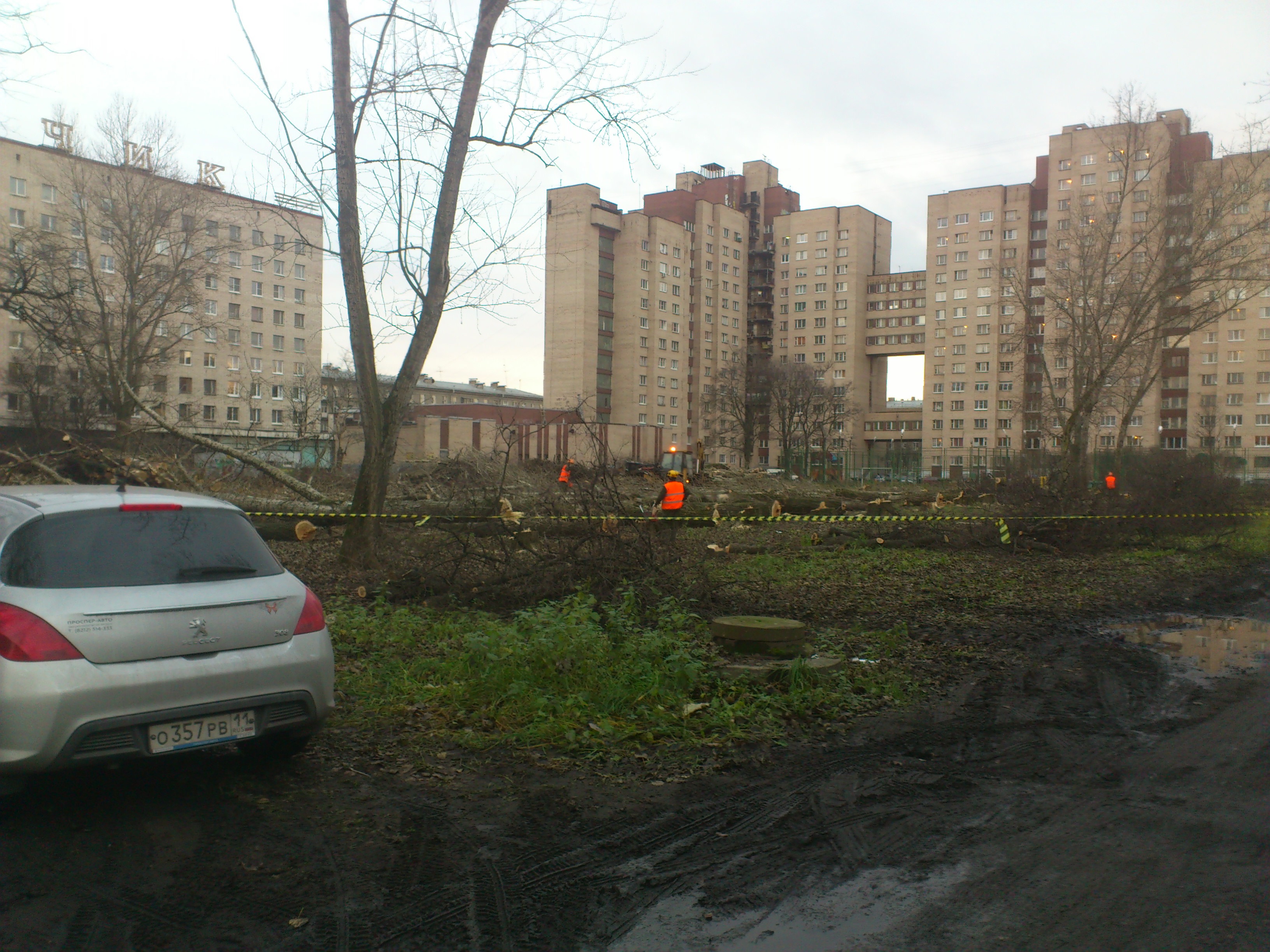 Сообщаю, что с 8 ноября 2013 года в сквере, расположенном между домом 72 по проспекту Стачек и домами 8 и 10 по улице Маршала Говорова силами ООО «Карат» осуществляется вырубка зеленых насаждений внутриквартального озеленения.