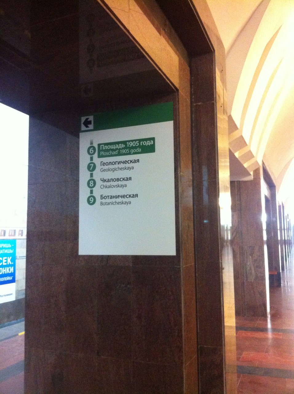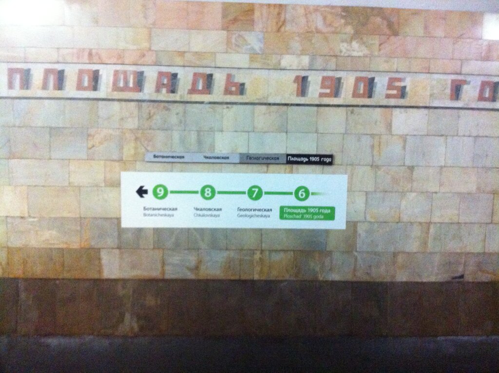 "Эпидемия НИПа" настигла Екатеринбургский метрополитен. Экспериментальные указатели появились на станции "Площадь 1905 года". Екатеринбург последовал примеру Украины и Белоруссии, где станциям была присвоена нумерация (фото с ssc):