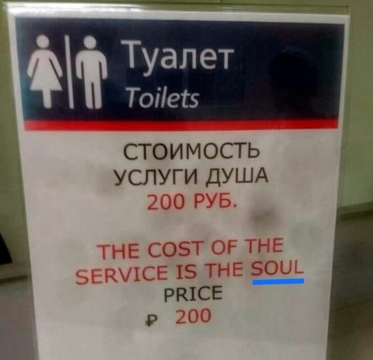 Я так понимаю, переводили в деревнях, где нет переводчиков. Тупо вбили в гугл переводчик, и не глядя распечатали. Может позже и заметили. Но типа, уже распечатано, и переделывать - дополнительные вложения, поэтому оставили как есть. В надежде, что иностранцы если что-то не поймут — спросят. Что по сути, таблички делает бессмысленными. Спросить можно и без них. Равно как и догадаться, если к примеру, были бы пиктограммы.