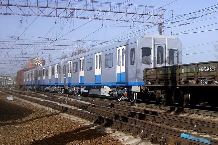 на примыкающие к метровагонам обычные жд вагоны вешается метросцепка (сцепка Шарфенберга). или наоборот - на метровагон обычная жд сцепка. На фото- перегон Мытищи-Москва
