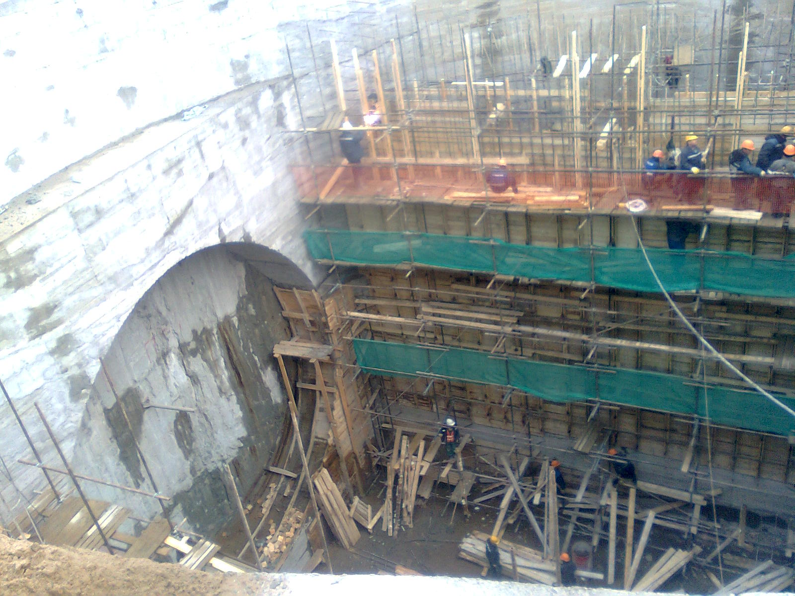 Внутри ограждающего контура из БСС сооружается монолитный ствол большого диаметра.