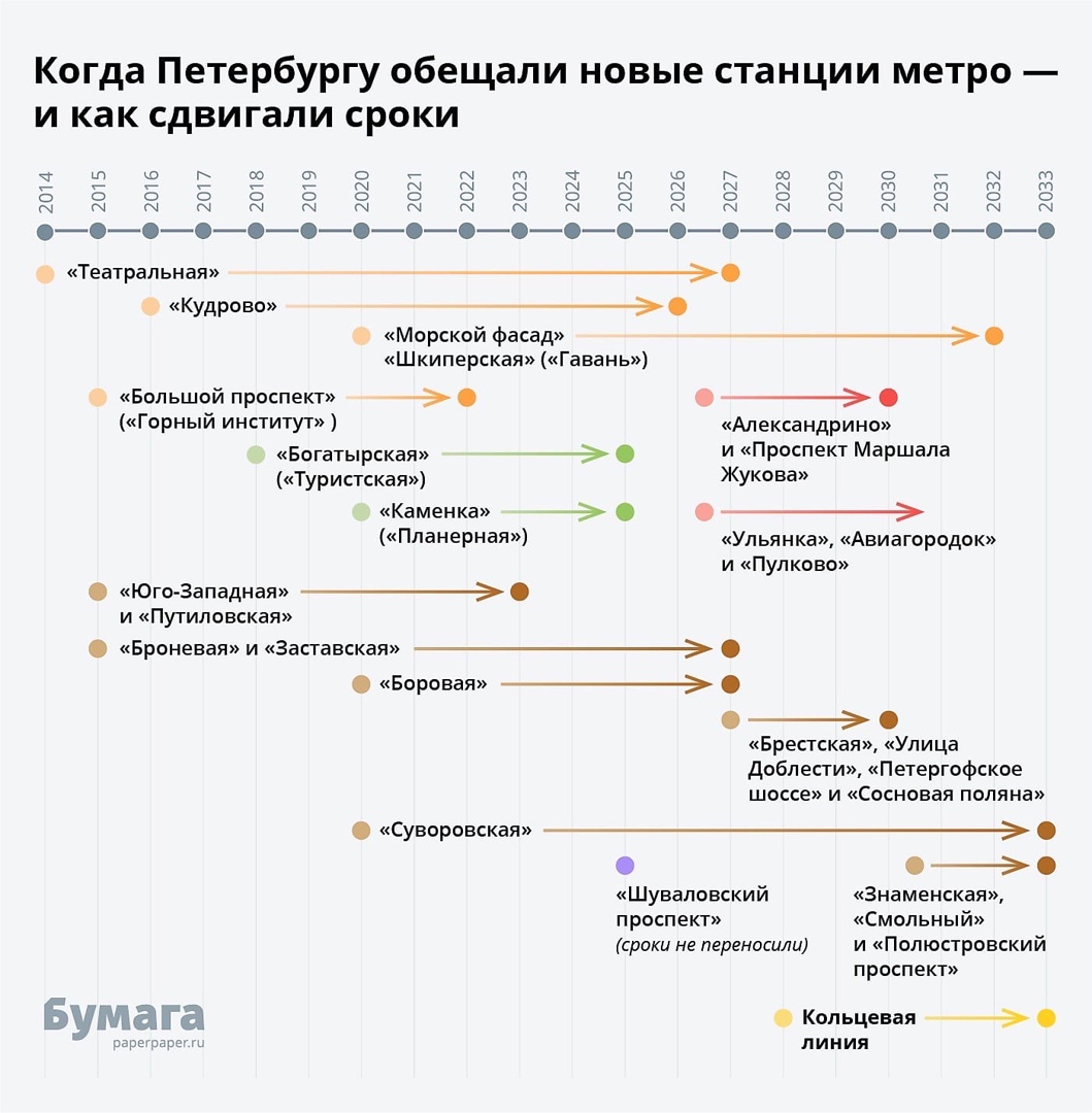 Согласно документу в 2021 году со строительства Красносельско–Калининской линии (ККЛ, "коричневая" ветка) от "Путиловской" до "Юго–Западной" срежут почти 1,4 млрд рублей, в результате чего бюджет объекта с 6,1 млрд сократится до 4,7 млрд рублей. Финансирование Лахтинско–Правобережной линии (ЛПЛ, "оранжевая" ветка) на участке от "Спасской" до "Горного института" уменьшится до 2 млрд рублей в текущем году, объект потеряет почти 400 млн рублей.