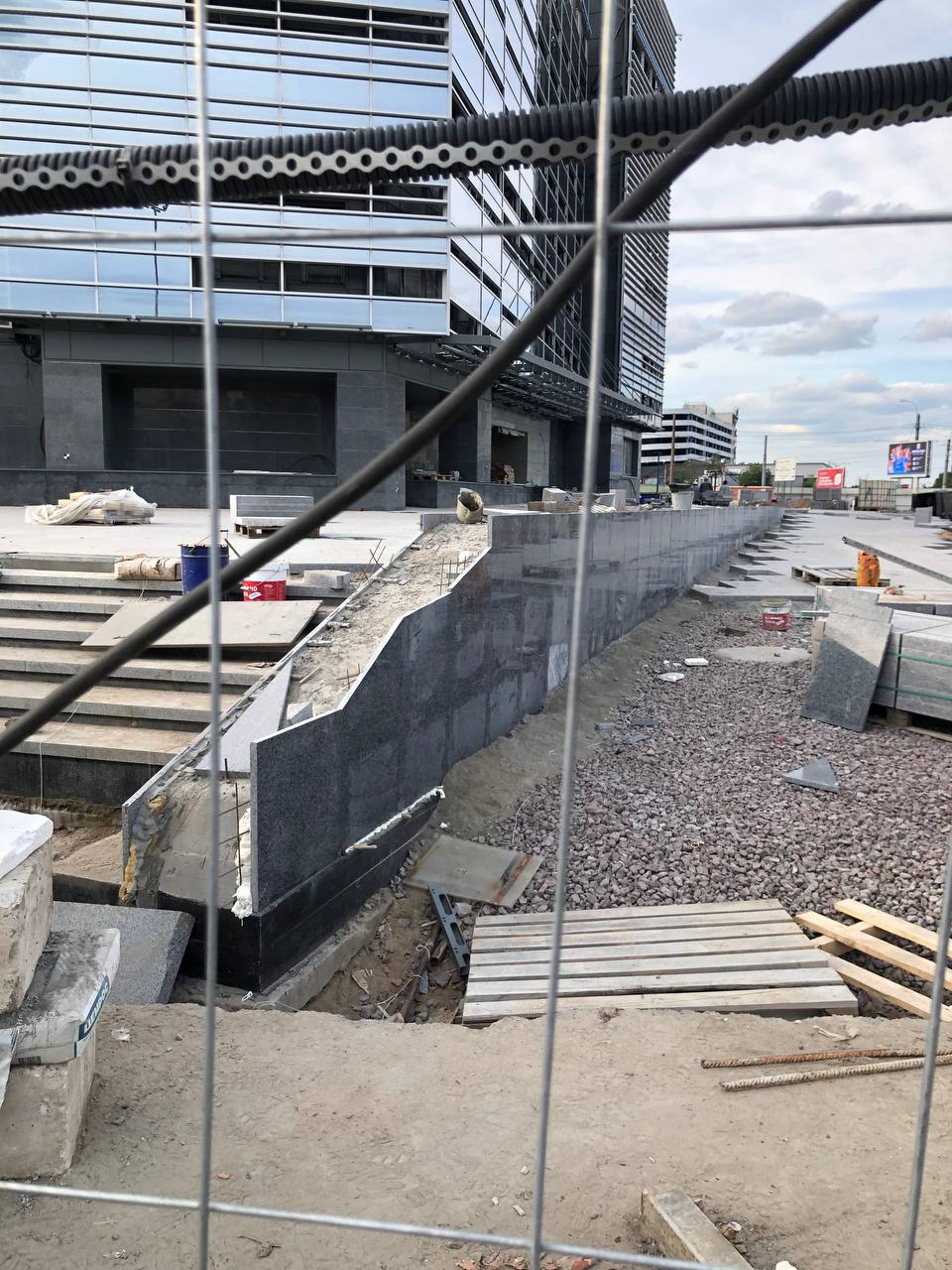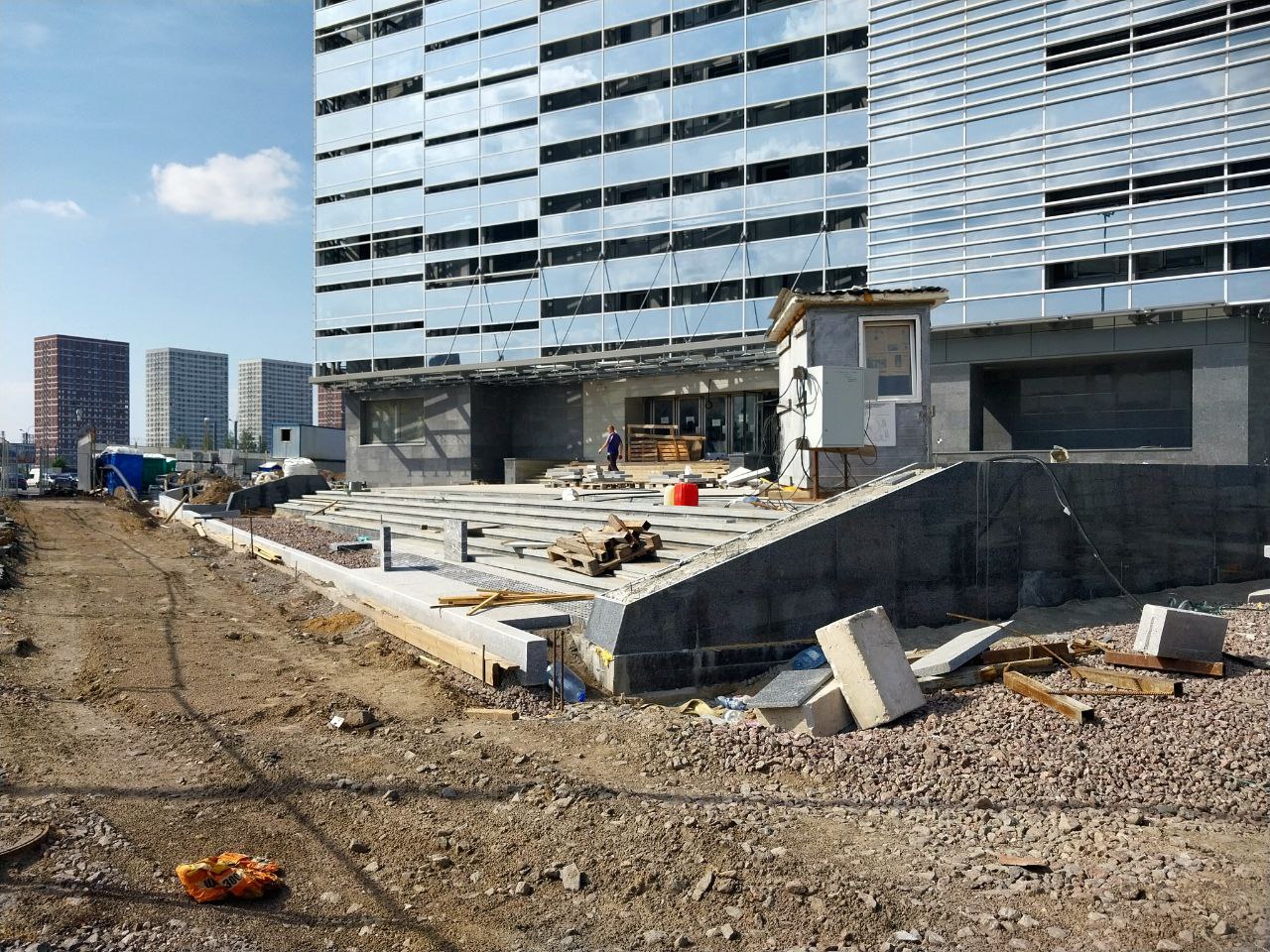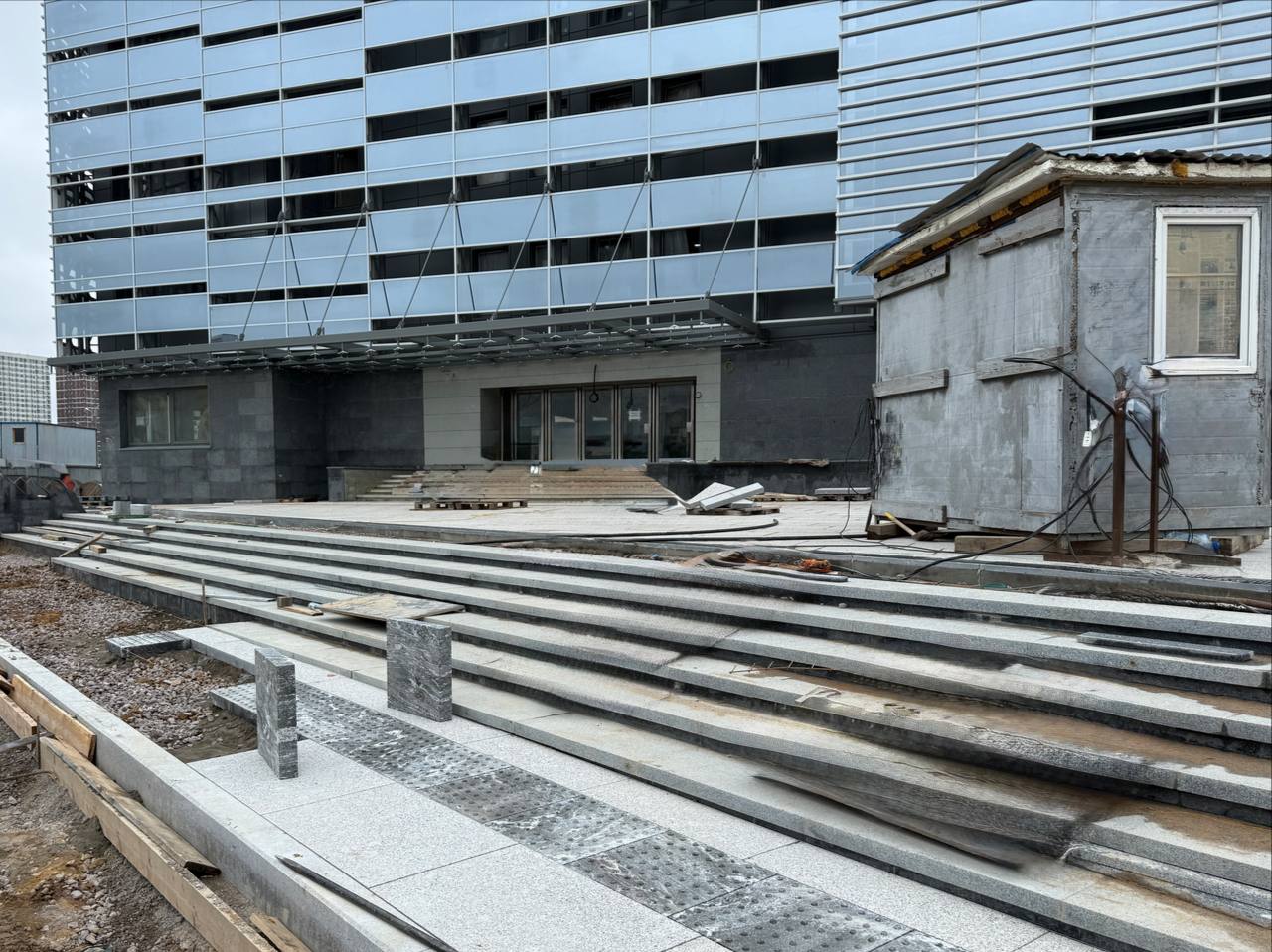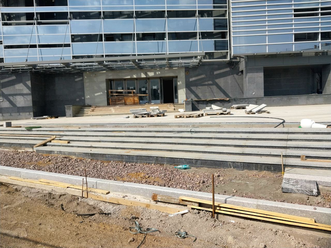 Продолжается облицовка гранитом ступеней лестницы, ведущей ко входу и выходу здания. Специалистам предстоит восстановить более 1 500 м2 газона.