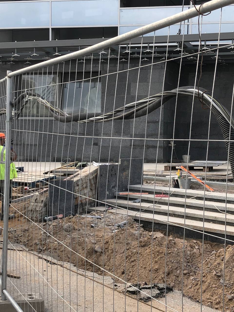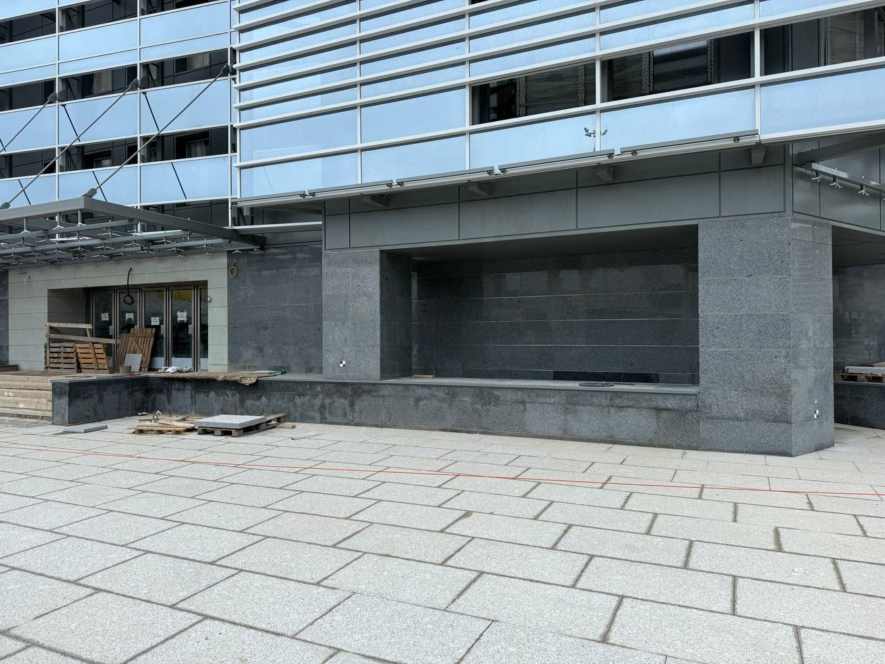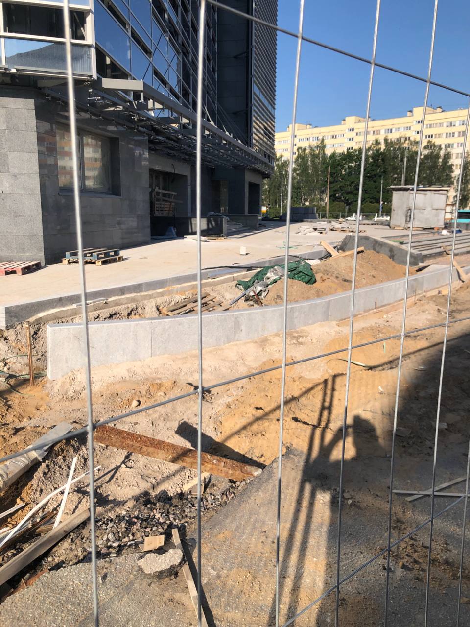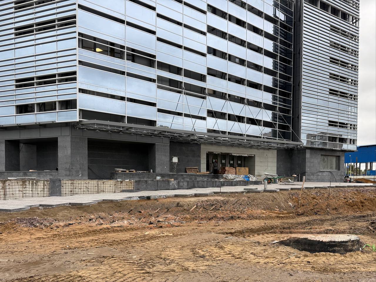 Продолжается облицовка гранитом ступеней лестницы, ведущей ко входу и выходу здания. Специалистам предстоит восстановить более 1 500 м2 газона.