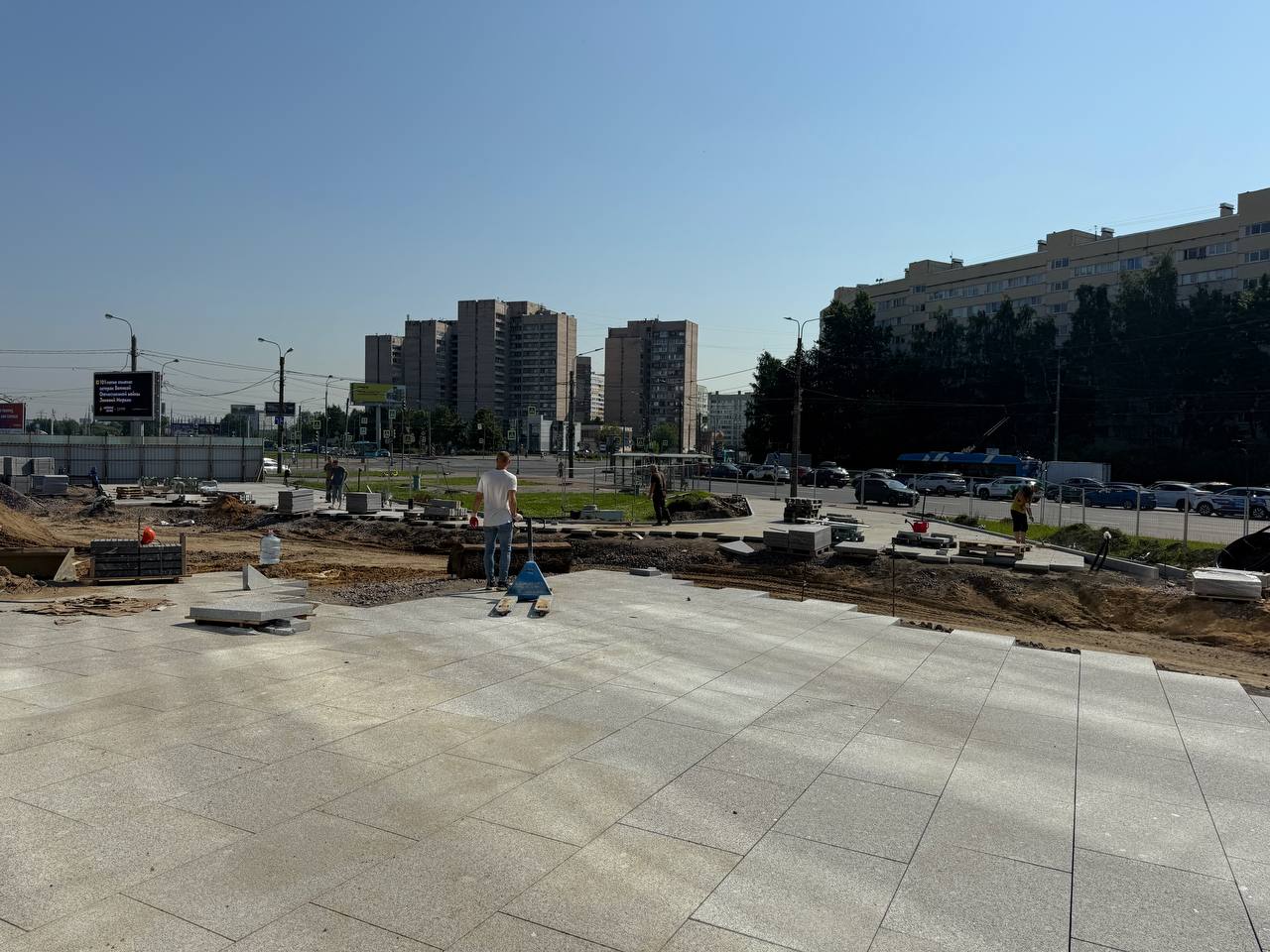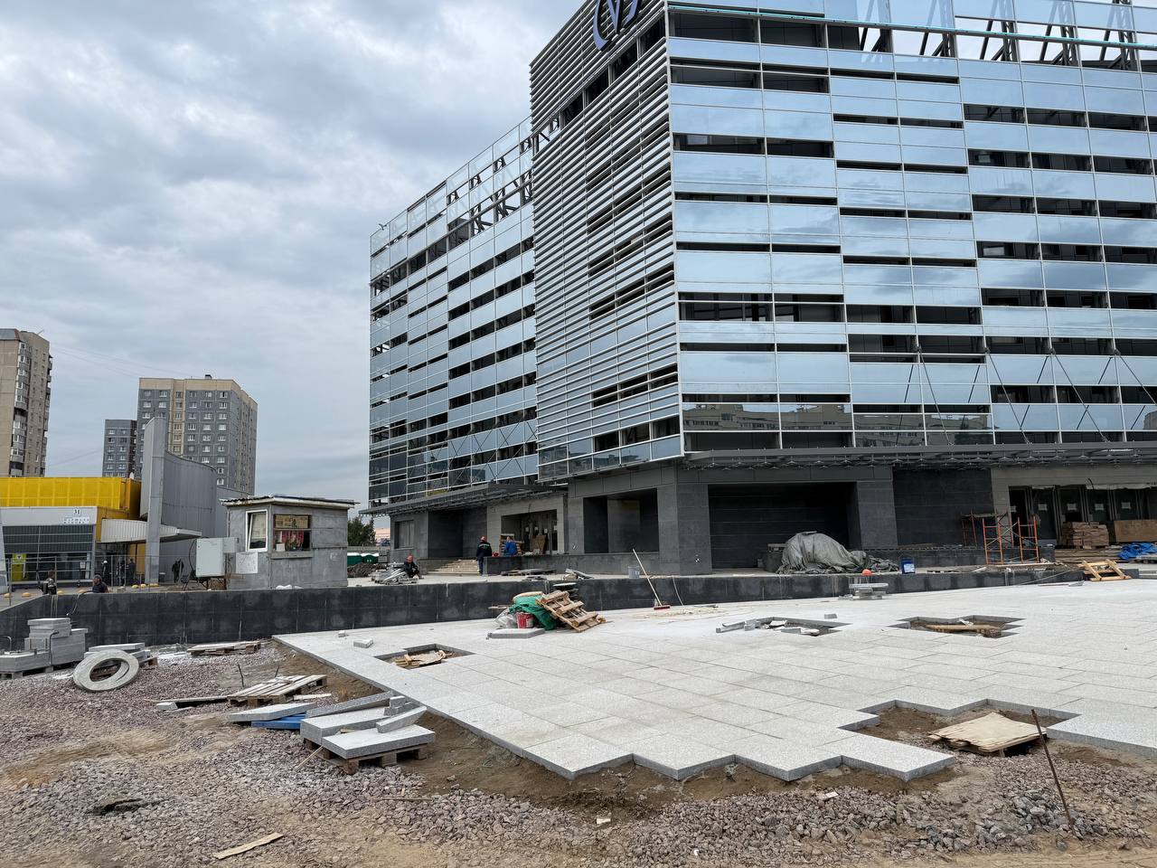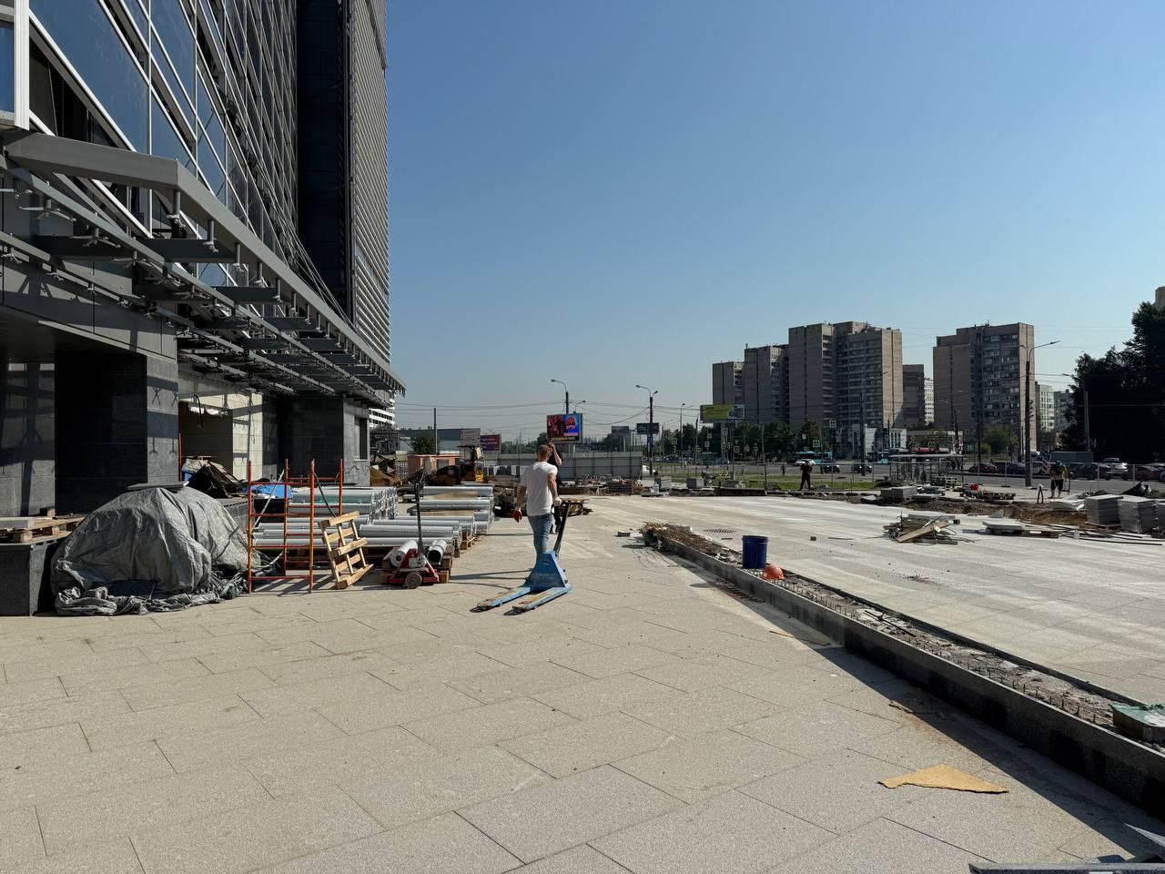Сейчас метростроители укладывают тротуарные плиты из натурального камня вокруг вестибюля – смонтировано около 1400 м2 из более чем 3 000 м2.