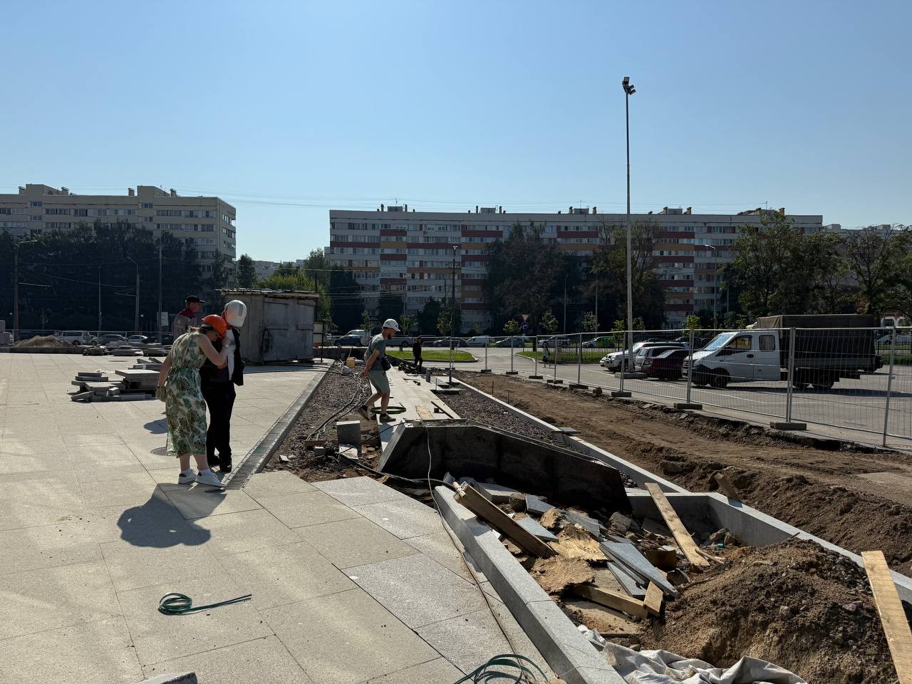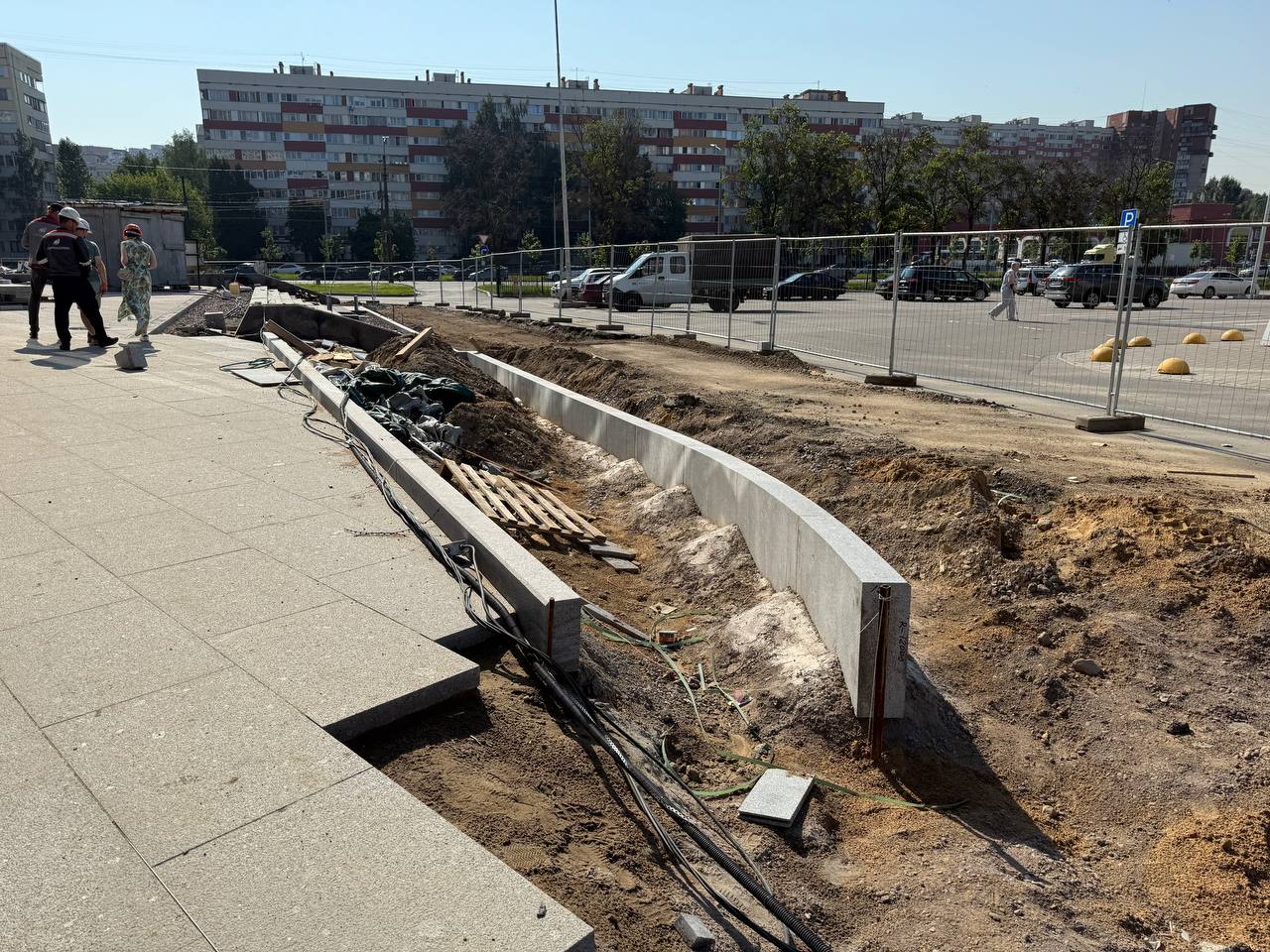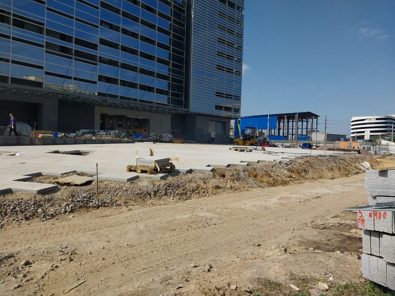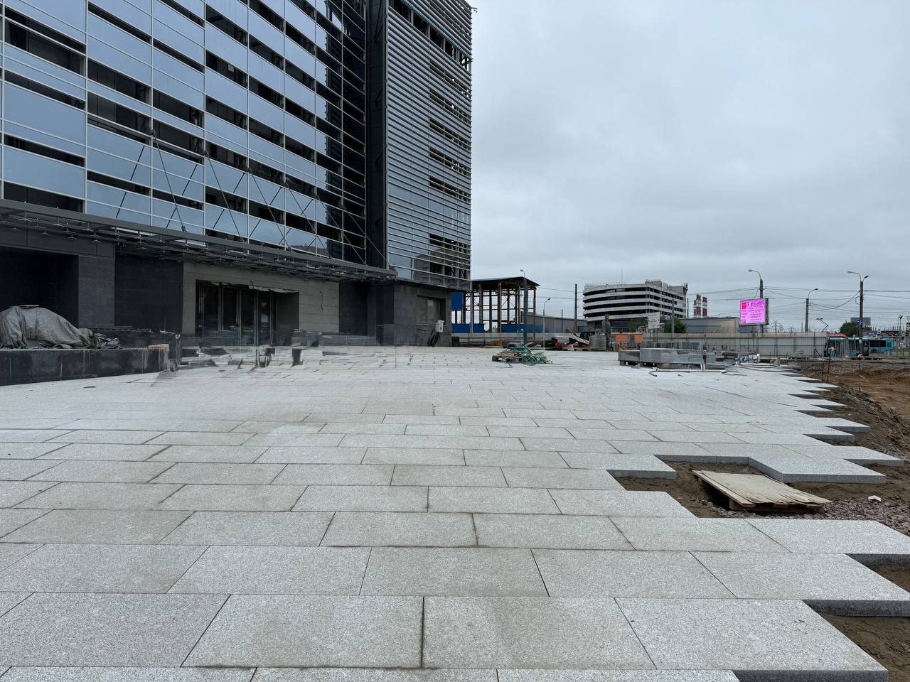 Сейчас метростроители укладывают тротуарные плиты из натурального камня вокруг вестибюля – смонтировано около 1400 м2 из более чем 3 000 м2.