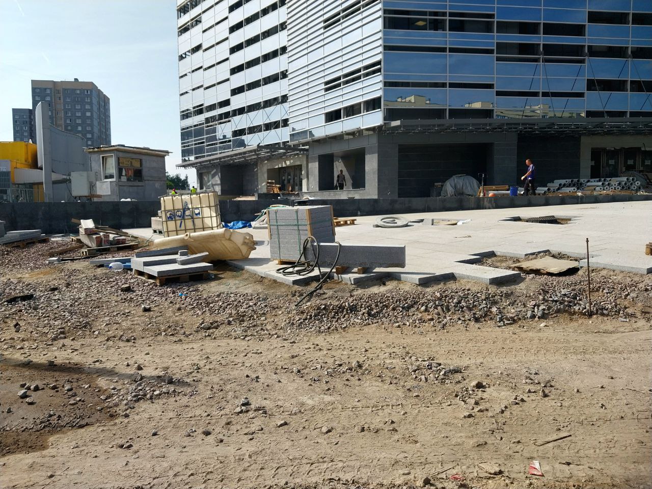 - На площади перед входом/выходом идёт укладка плит из натурального камня.
