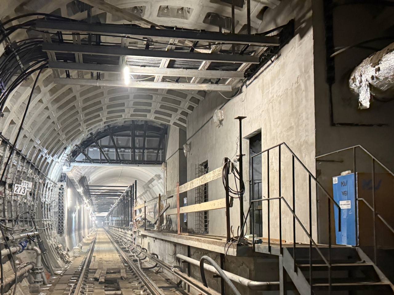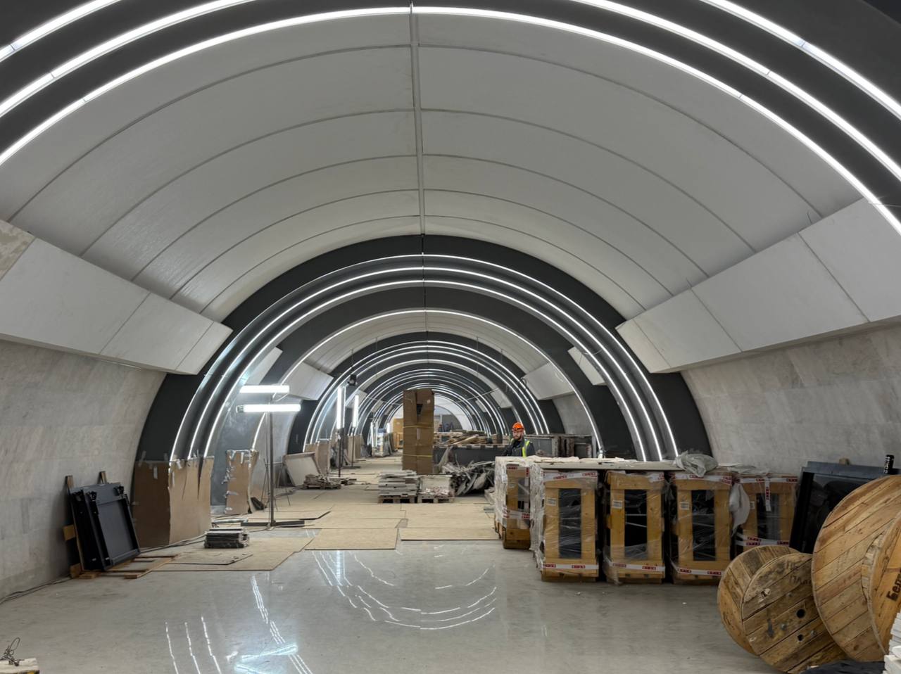 В тамбурах у входа и выхода вестибюля станции в Красносельском районе идут работы по монтажу теплового оборудования, а также монтажу потолочных элементов - кубботы и светильников.