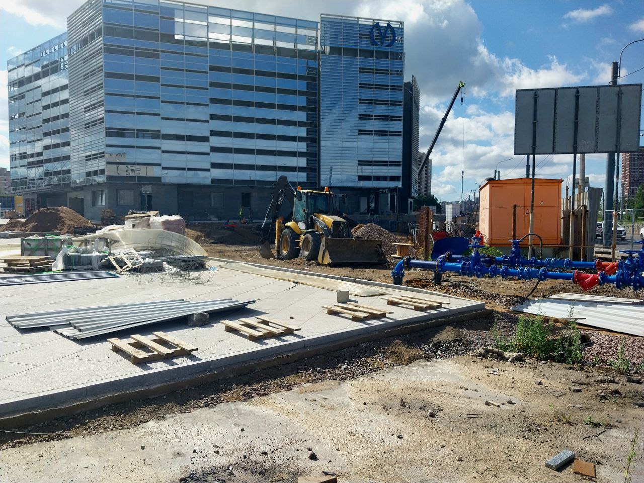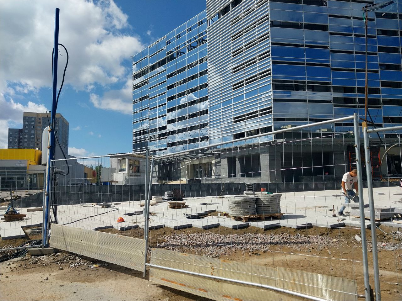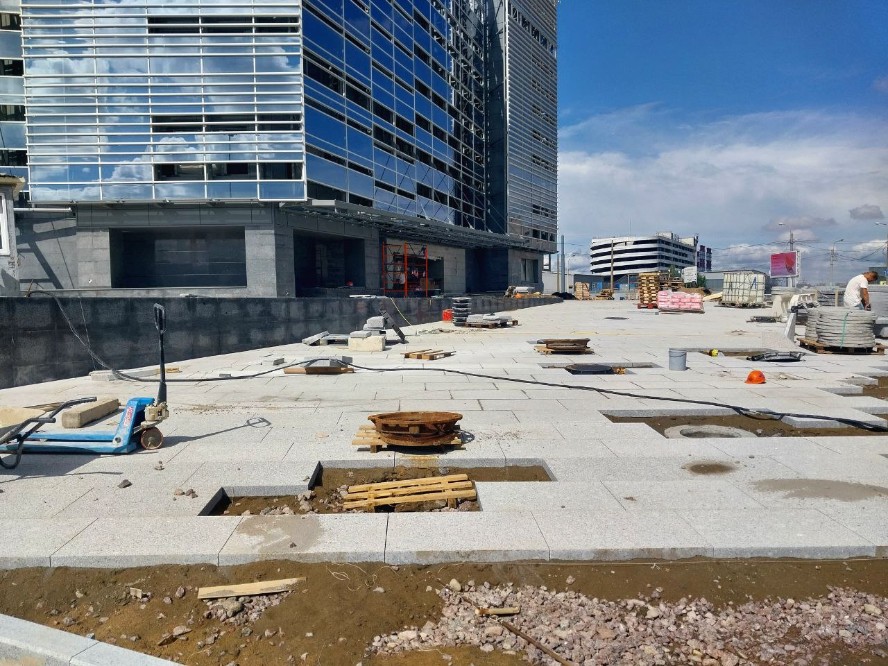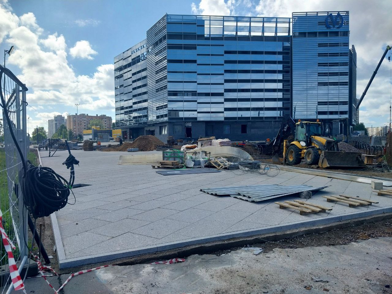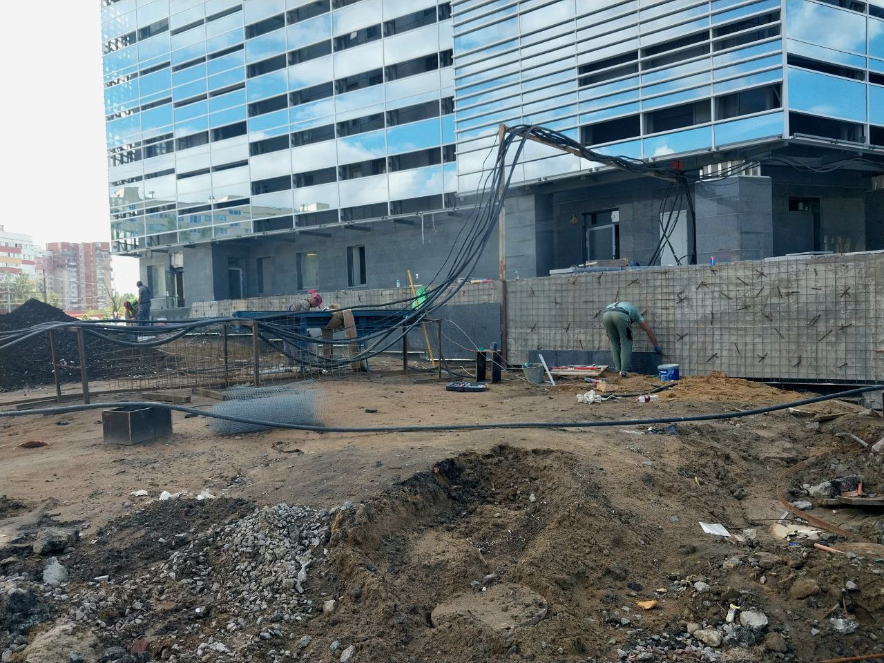 - На площади перед входом/выходом выполнена основная часть работ по укладке плит из натурального камня. Оставлен технологический проезд для доступа вглубь площадки, который будет убран и благоустроен после выполнения работ со стороны улицы Маршала Казакова.