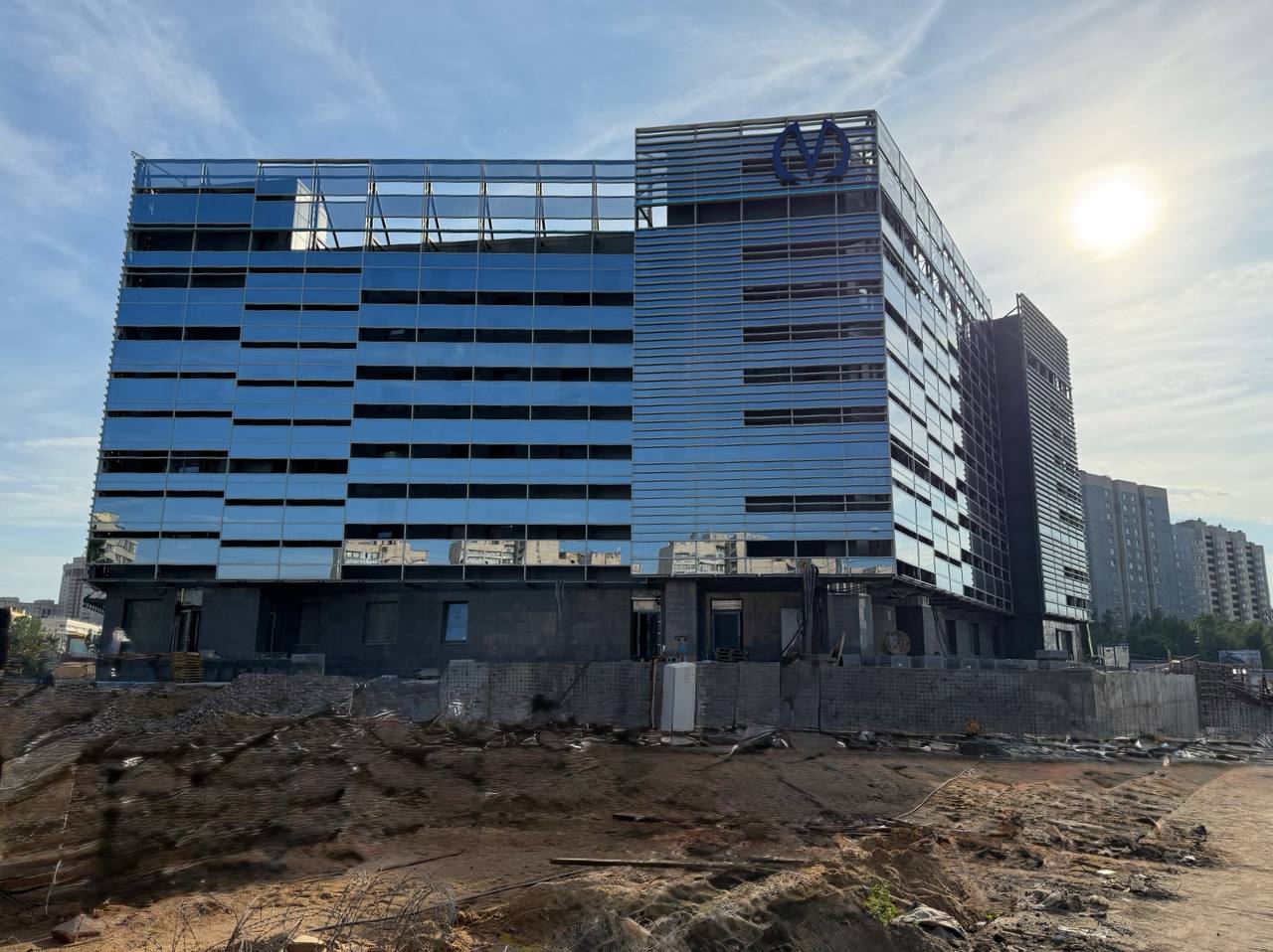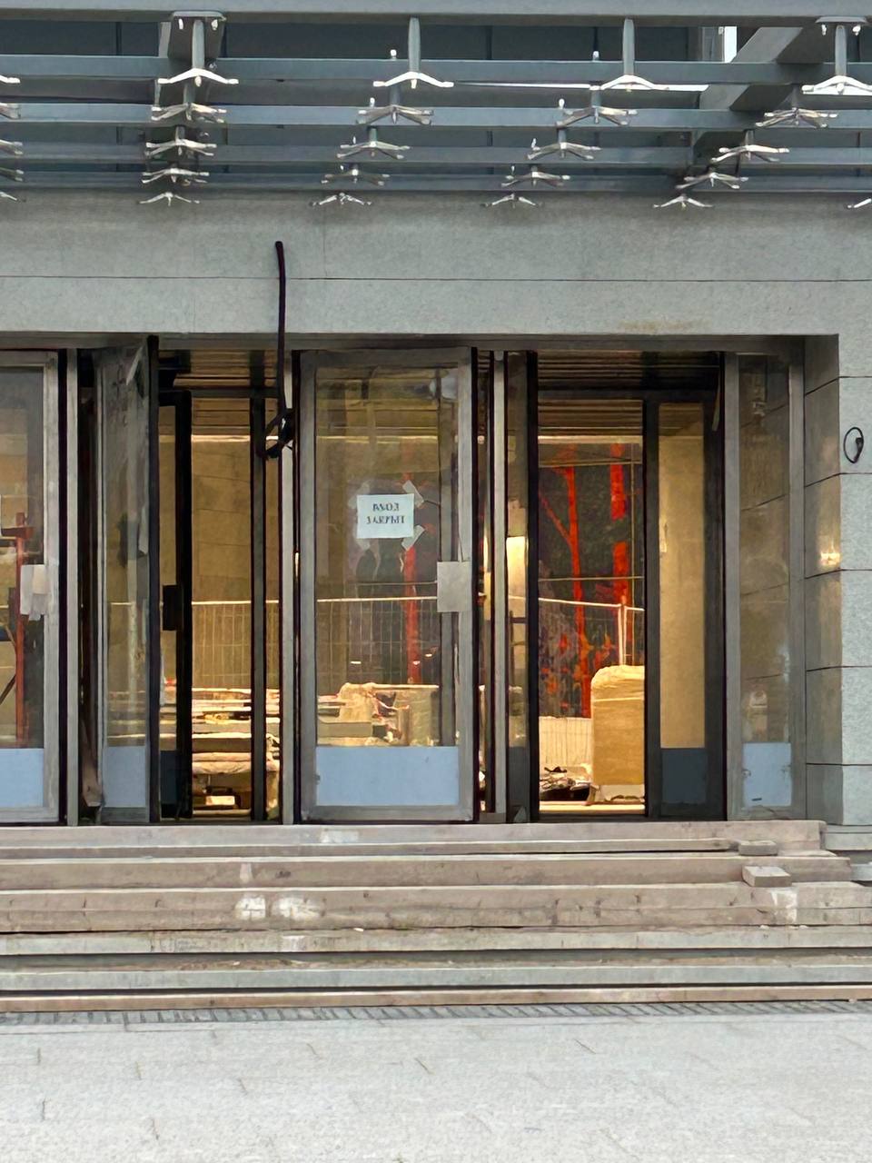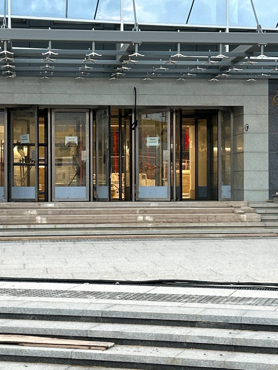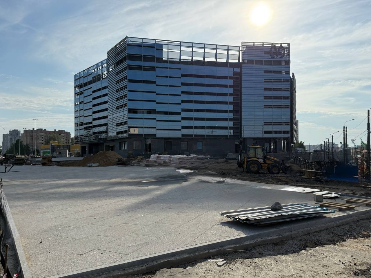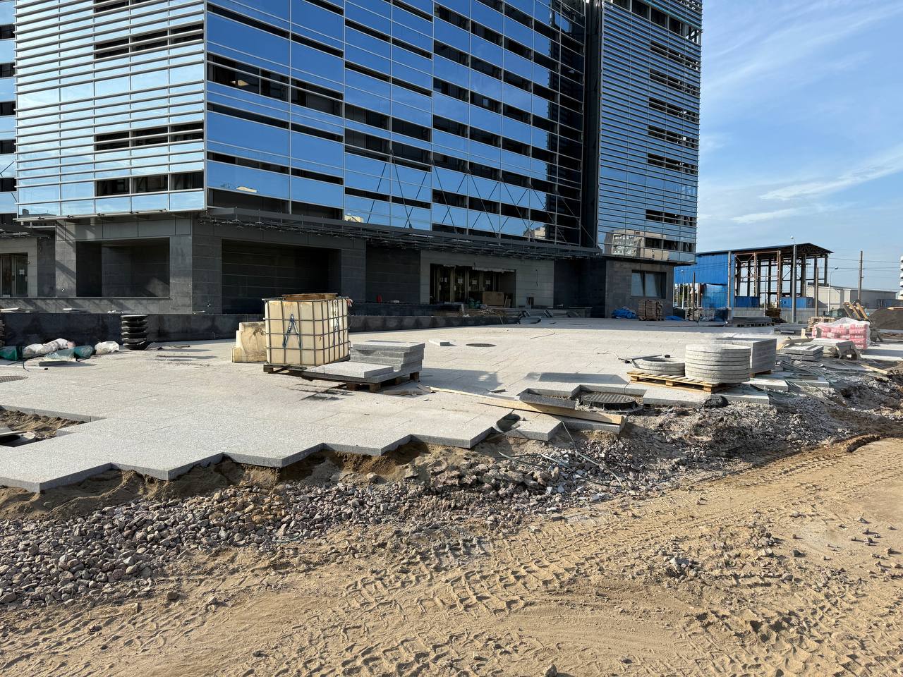 - На площади перед входом/выходом выполнена основная часть работ по укладке плит из натурального камня. Оставлен технологический проезд для доступа вглубь площадки, который будет убран и благоустроен после выполнения работ со стороны улицы Маршала Казакова.