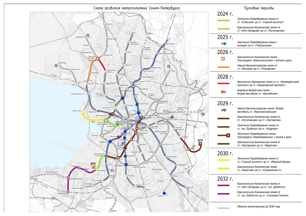 Эти даты основаны на сроках проектирования и строительства, от которых отталкивается ЛМГТ. Хотя компания указывает и другие, связанные с приоритетами Центра транспортного планирования и Петербургского метрополитена (именно он станет заказчиком в части реконструкции станций, которой тоже займется МССС). Где-то они совпадают, где-то разнятся незначительно. Но, к примеру, отнесенные на 2029 год объекты, согласно этой альтернативной версии, значатся в 2026-м; новые вестибюли станций, наоборот, улетают к 2033-му, а «Морской фасад» — к 2035-му.