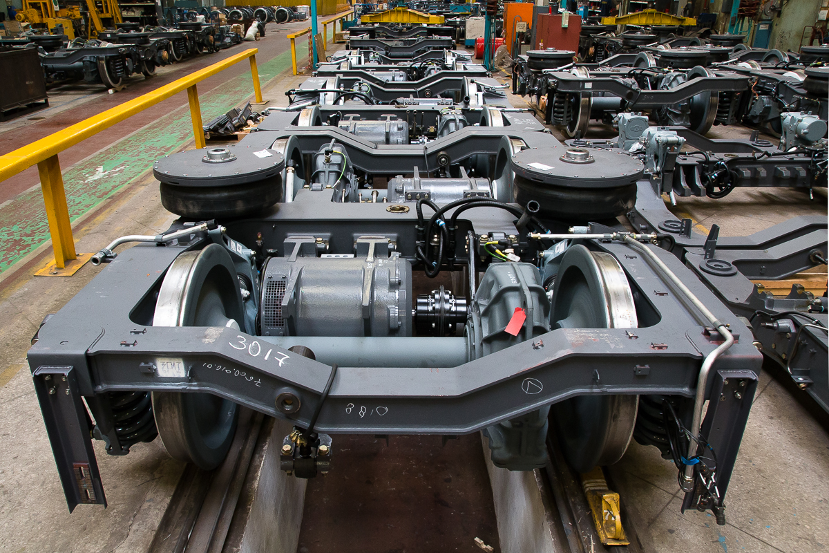 Участок сборки тележек. Здесь собираются тележки не только для вагонов метро, но и для рельсовых автобусов. Предприятие получает готовые рамы тележек, также отдельно поступают колесные пары, и производится сборка. Сначала обвязывается рама тележки, потом ее устанавливают на колесную пару, а затем уже готовая тележка проходит испытания.
