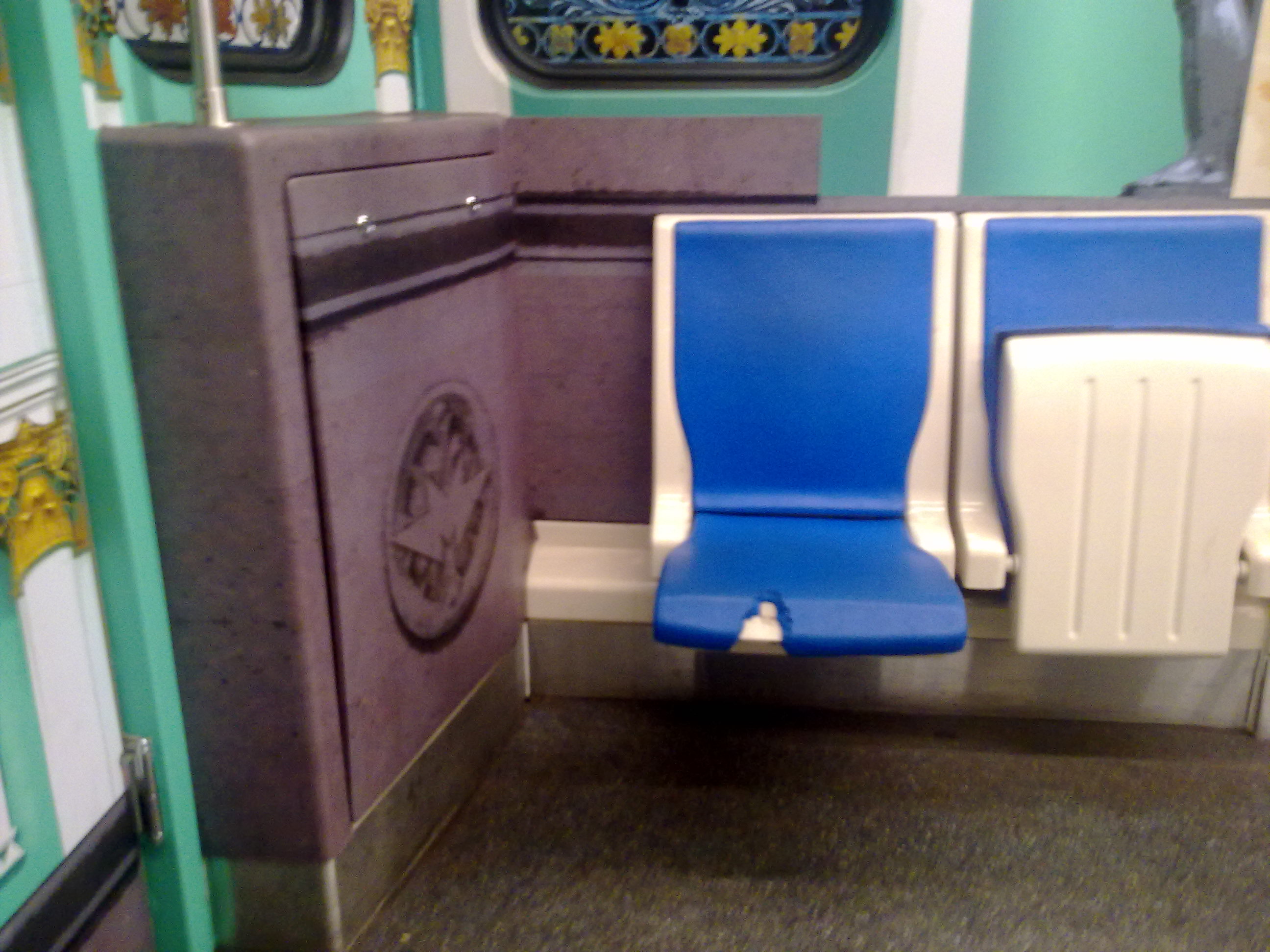 2. Быдло раздолбало вагоны в хлам: отгрызенные куски сидений, обклеенные наклейками стены, проковырянная плёнка, не складывающиеся сидения (заклинило в раскрытом виде), складывающиеся сидения со сломанным доводчиком (громкое "бабах" на весь вагон).