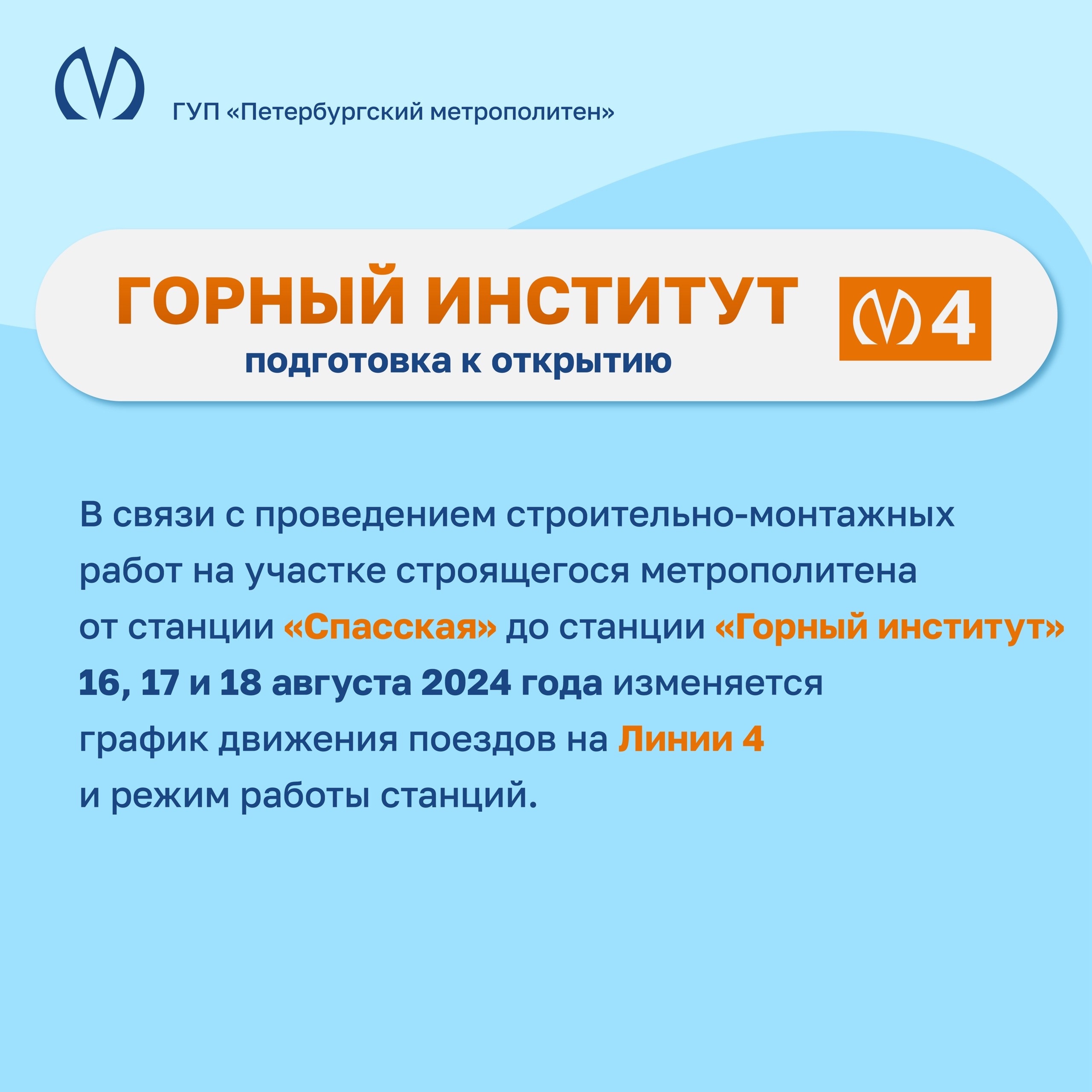 В связи с проведением строительно-монтажных работ на участке строящегося метрополитена от станции «Спасская» до станции «Горный институт» 16, 17 и 18 августа 2024 года изменяется график движения поездов на Линии 4 и режим работы станций.