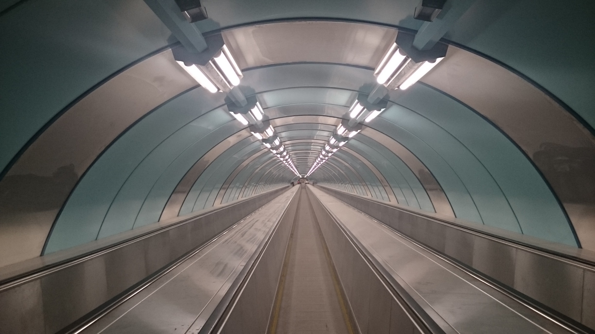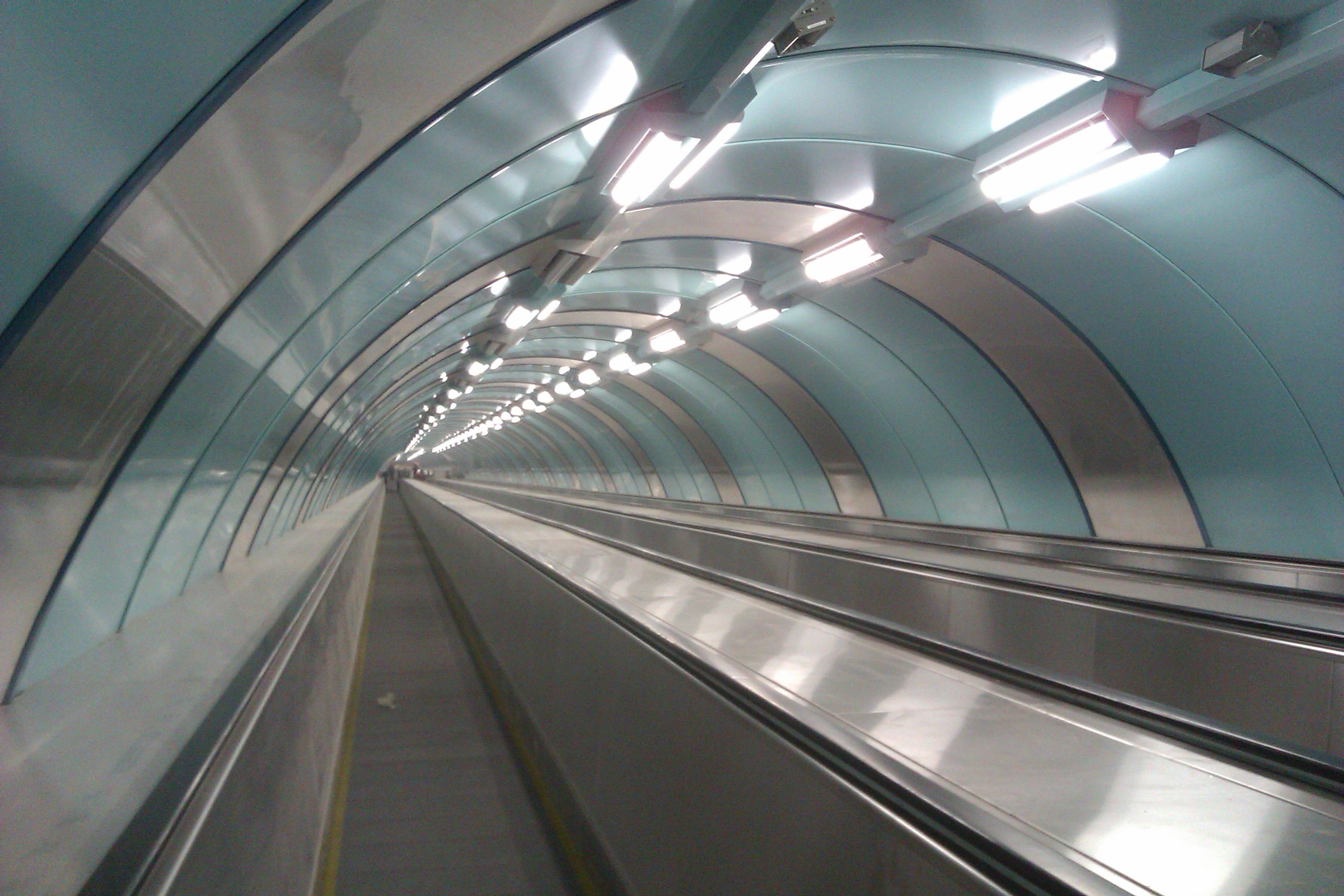 И, пользуясь случаем, посылаю -1 в карму проектировщикам, добавившим полтора десятка ступеней между уровнем пола станции и началом травелаторов. Теперь эта красота видна во всей красе.