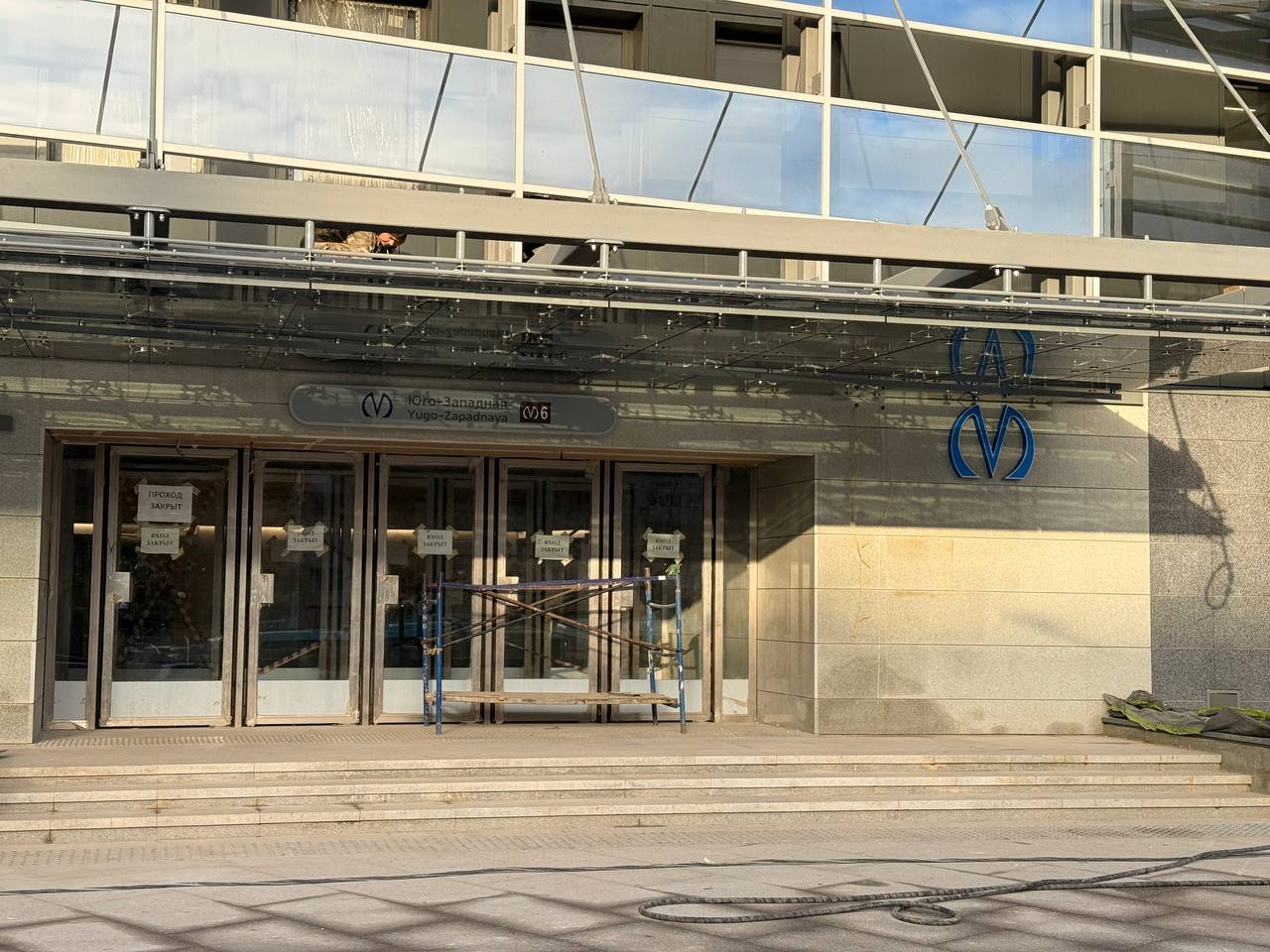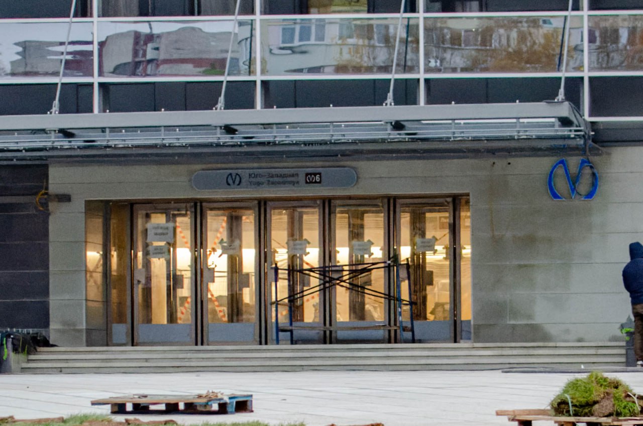 На вестибюле станции «Юго-Западная» строящейся Красносельско-Калининской линии Петербургского метрополитена появились информационные указатели с названием станции, номером и цветом линии.