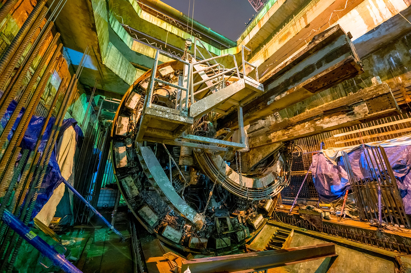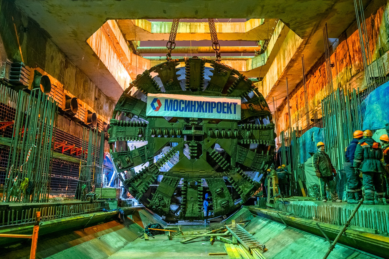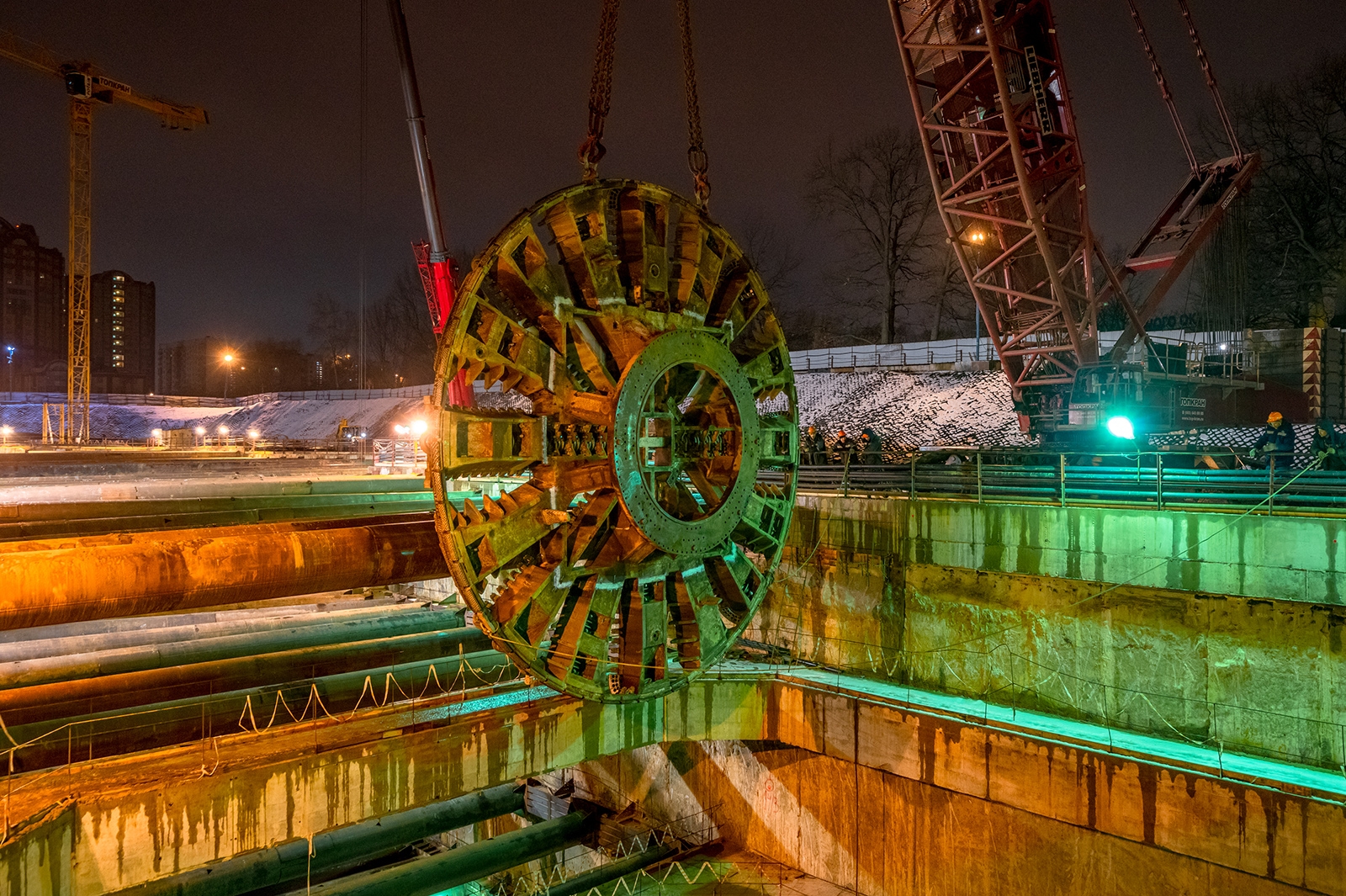 Сборка щита-гиганта – сложный технологический процесс. Сначала на поверхности была проведена укрупненная сборка трех технологических телег тоннелепроходческого механизированного комплекса (ТПМК) весом 90, 150 и 126 тонн, а также сварка 160-тонного ротора. Затем эти элементы опустили в котлован с помощью крана. Головная часть щита весом более 780 тонн опускалась отдельными сегментами и собиралась в котловане.