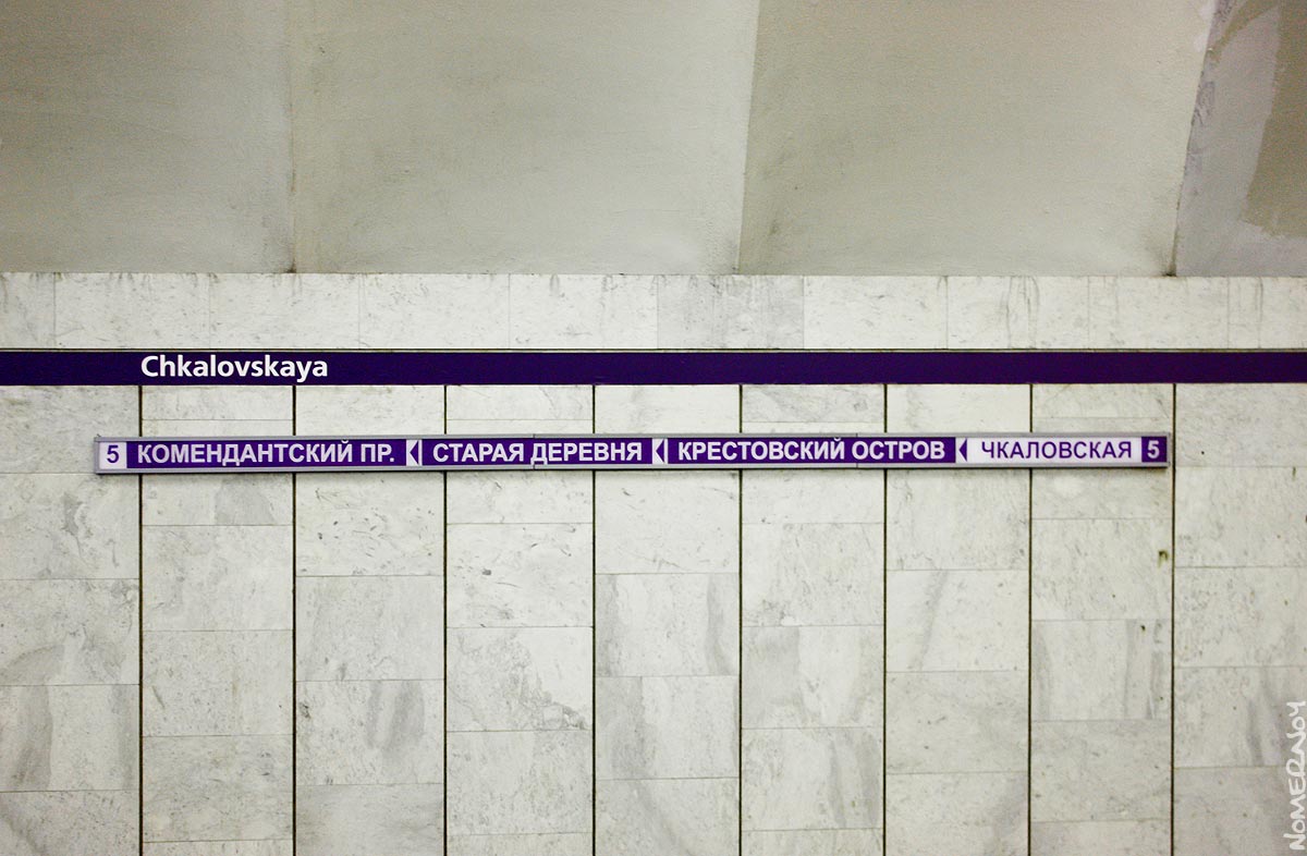 Над входом в вестибюль уже висит лайтбокс «(\/) Чкаловская / Chkalovskaya (\/)5», у турникетов над кабинкой дежурной ещё один, пока не работает. На выходе — «Большая Зеленина улица / Bol'shaya Zelenina street» и «Прохода нет / No entry».
