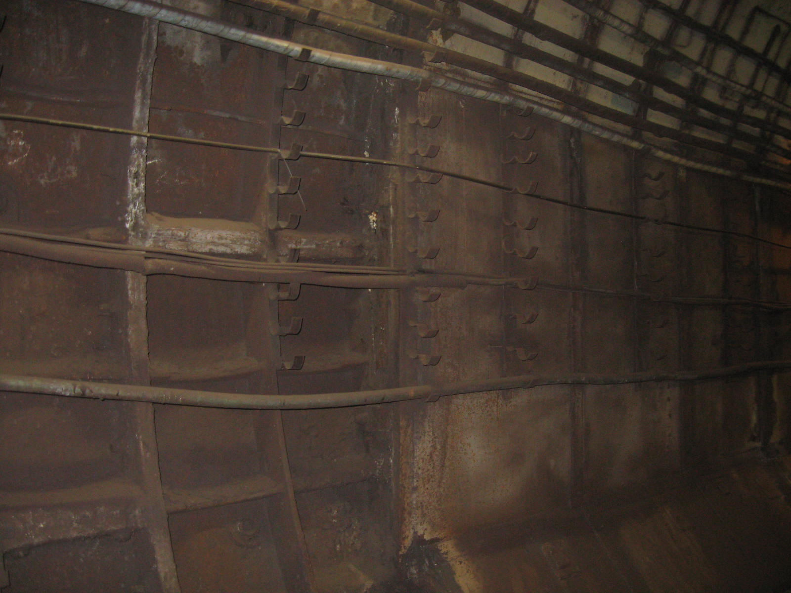 Усиление выполнено в правом тоннеле между пикетами 260+44 и 261+74 из-за течей и деформации колец, и, насколько я понимаю, уже после открытия участка. Из документов следует, что проект усиления был составлен после технического совещания в Ленметрострое от 10 декабря 1979 на основании маркшейдерской съёмки от 5-12 ноября 1979.