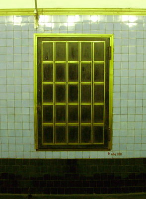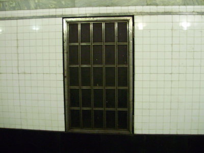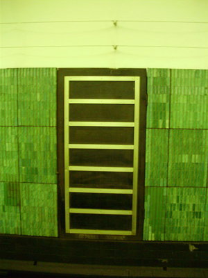 Ещё один тип оформления дверей на путевых стенах был впервые применён, по-видимому, на Академической. Конструкция проста – дверь разбита на отдельные квадраты, но следует обратить внимание, насколько тщательно эти квадраты «вписаны» в ряды плитки на путевых стенах, совершенно не нарушая её «бесконечной» перспективы.