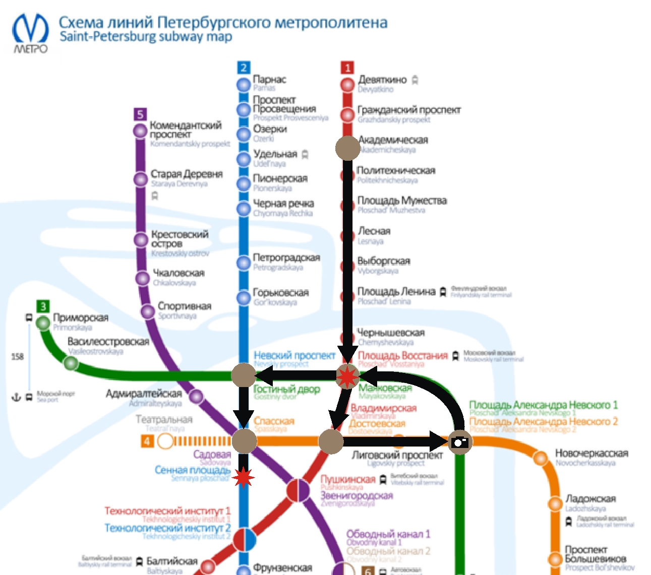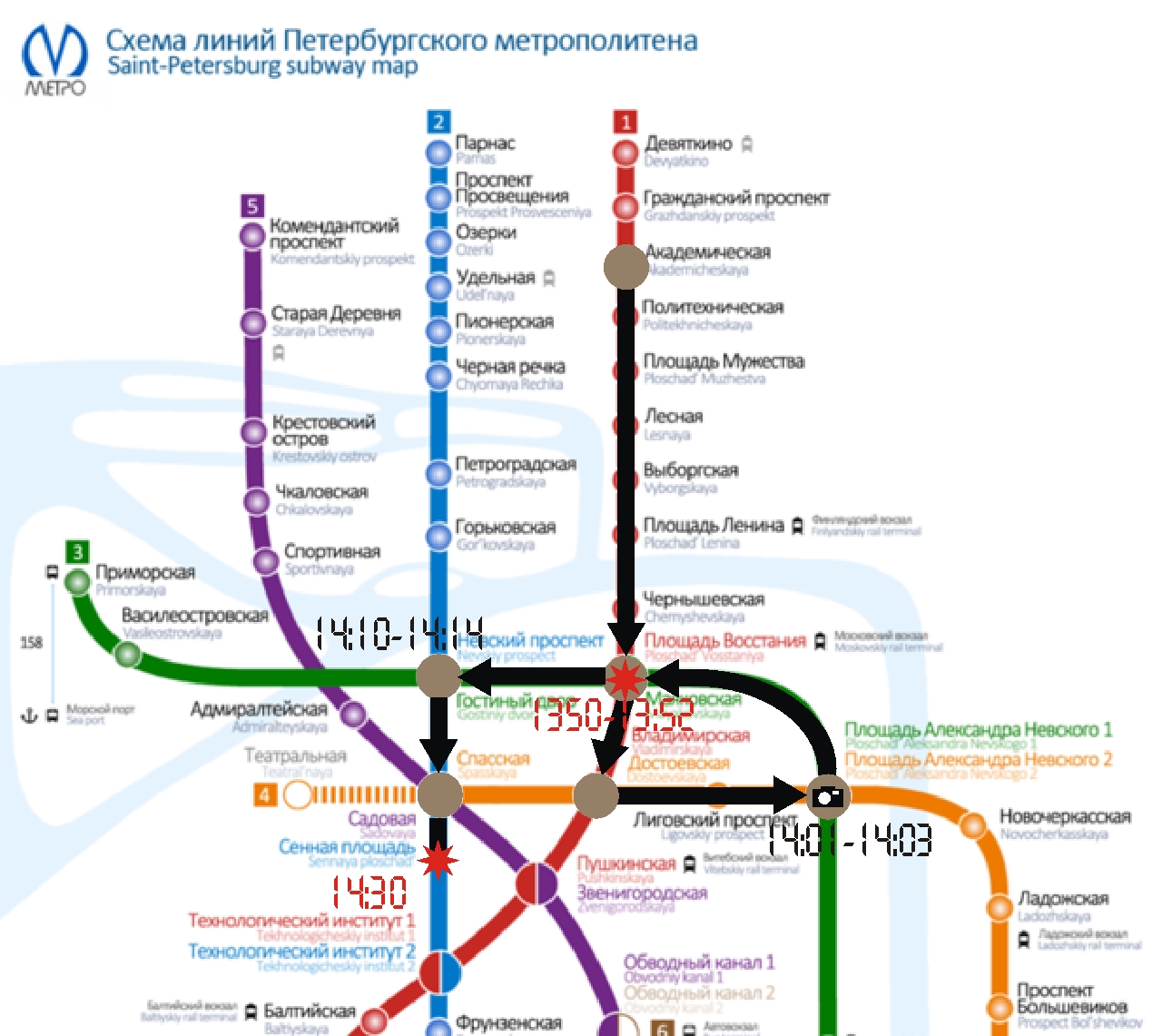 Надеюсь, когда расследование будет завершено, нам все подробно расскажут.[/quote]Минут 15 действительно лишние. Как вариант, возможно после того, как он приехал с ПлАНа на Маяковскую, он решил проверить, на месте ли сумка (или активировать устройство, хотя известно, что оно было часовым). А даже если не часовым, тогда важный момент - когда отключили мобильную связь на станции. В этом случае, террорист был на Маяковской в 14:06-14:07, и находился там следующие 15 минут, которые он потратил на стояние/обдумывание вблизи сумки на ПВ. Затем, поняв что что-то идёт не так, поехал в другое место (может он поехал не по НВЛ, а от ПВ до Достоевской, и далее до Спасской. А там пересел до Сенной. Так более логично, т.к. потерять 15 минут он мог только на ПВ, думая над оставленной ранее сумкой.