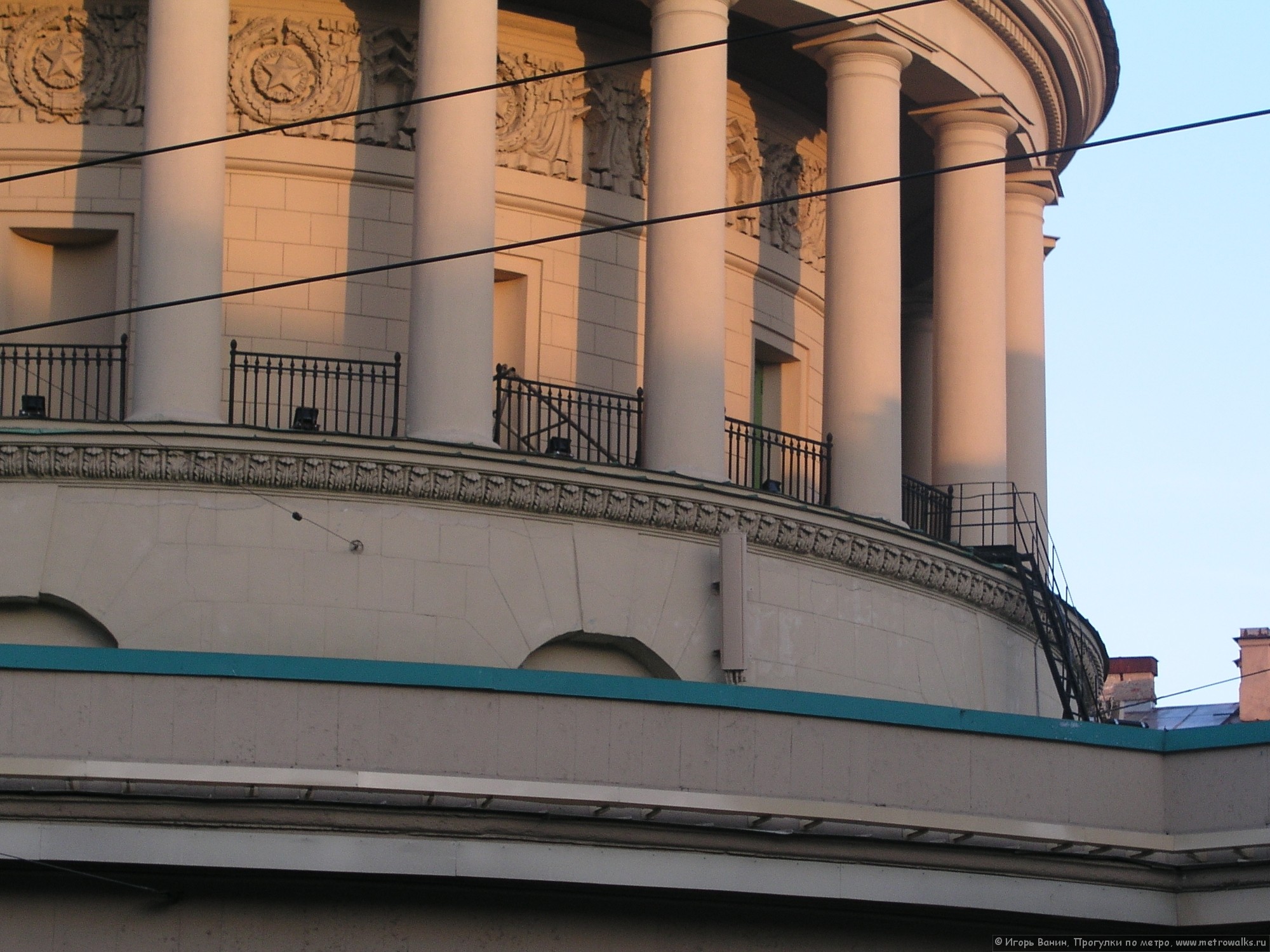 Я в июне 2004 фотографировал это место крупным планом с той же самой точки. Тогда штукатурка была на месте, но трещины уже были. Ещё одно отличие: раньше крепление подвески контактной сети было несколько ниже, точно там, где на твоём снимке штукатурка отсутствует. Подвеска может давать высокую нагрузку на стены, к которым она крепится. Может быть, она и вырвала этот кусок?