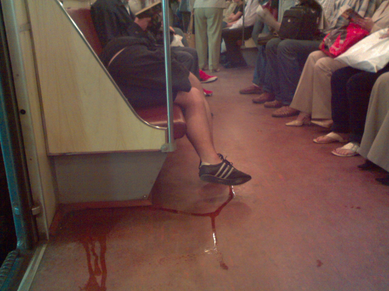Я думаю морс или что-то из напитков типа ягуар.....парень просто лежит на боку....а эта гадость растеклась потом на половину вагона
