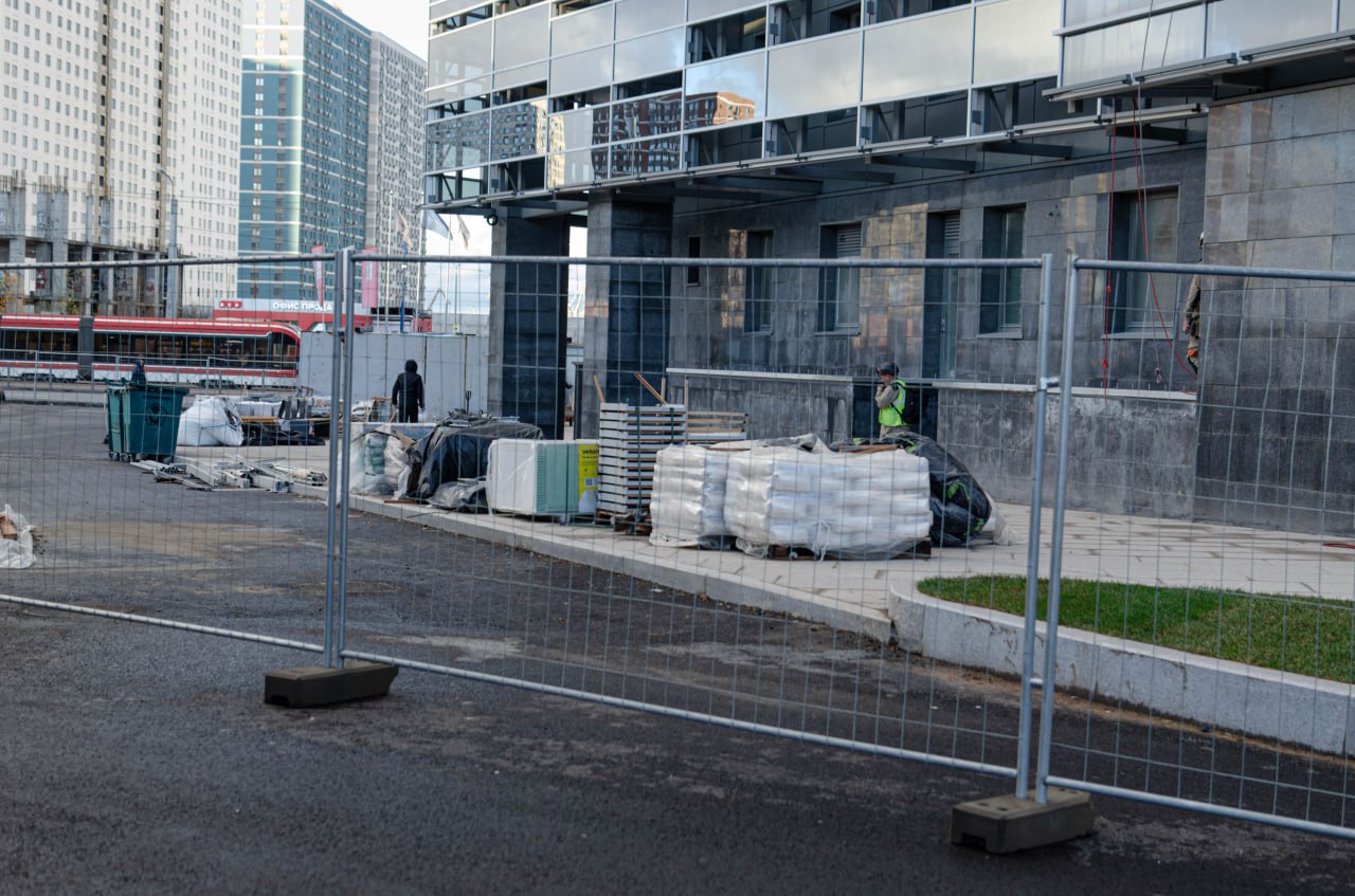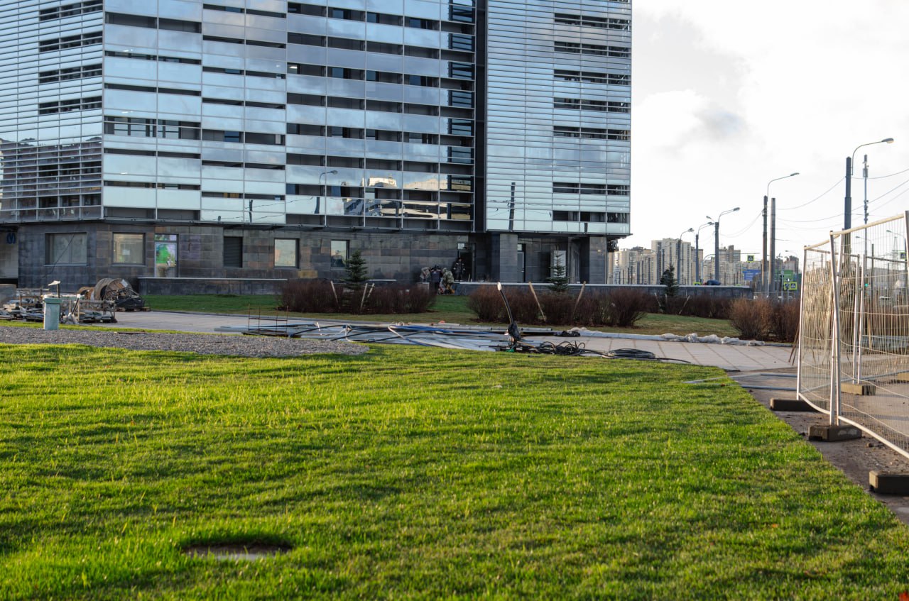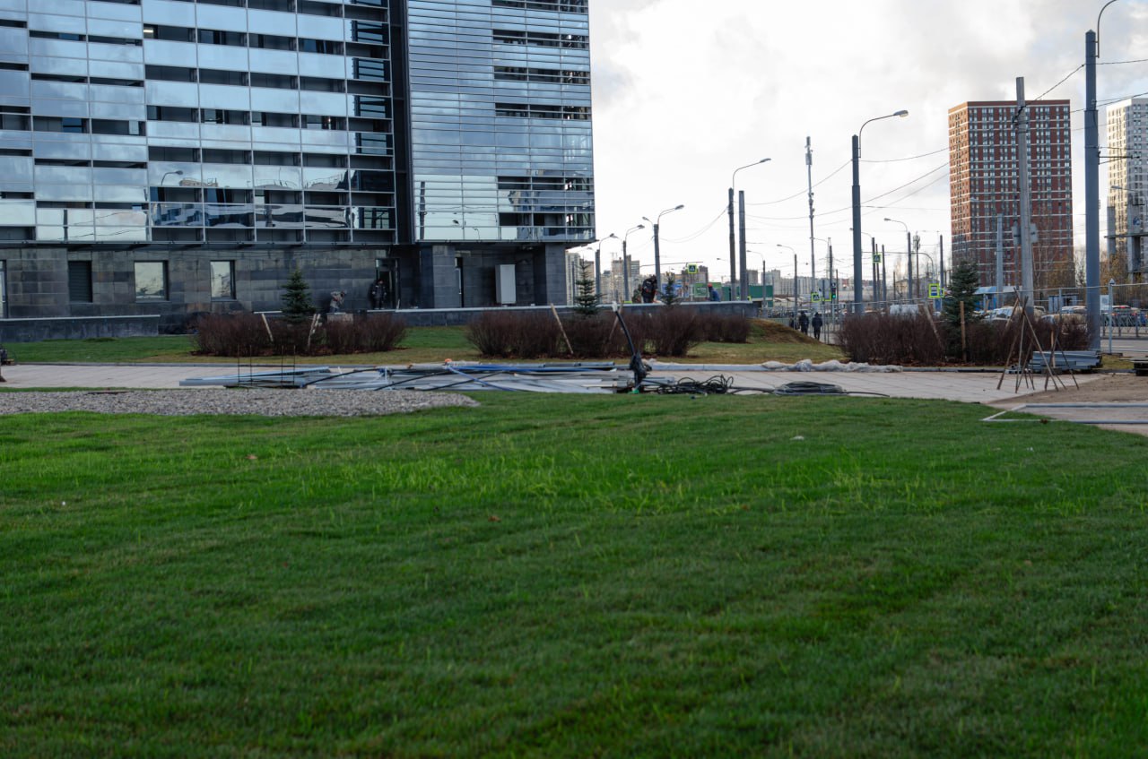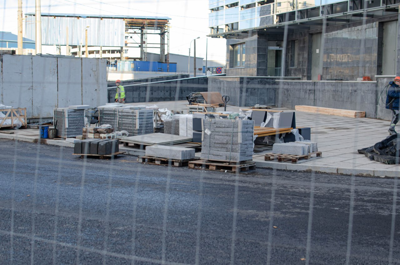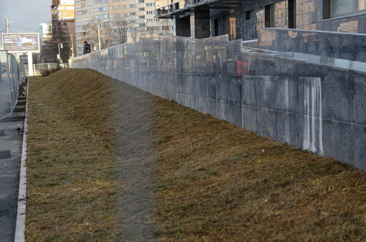 Завершают установку стеклянных ограждений, поставили гранитные поребрики, разделяющие газон и тротуар для предотвращения размыва, завезли каменные полусферы