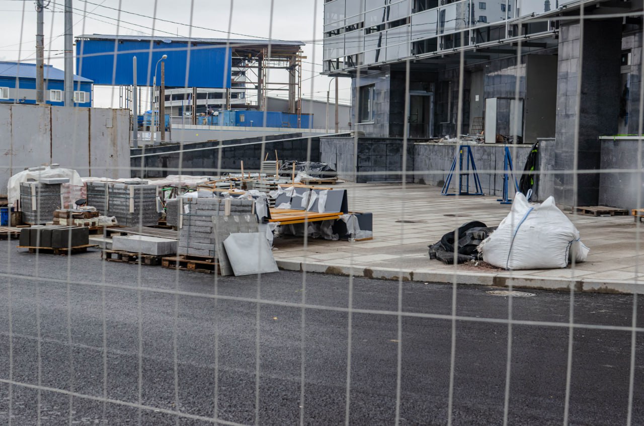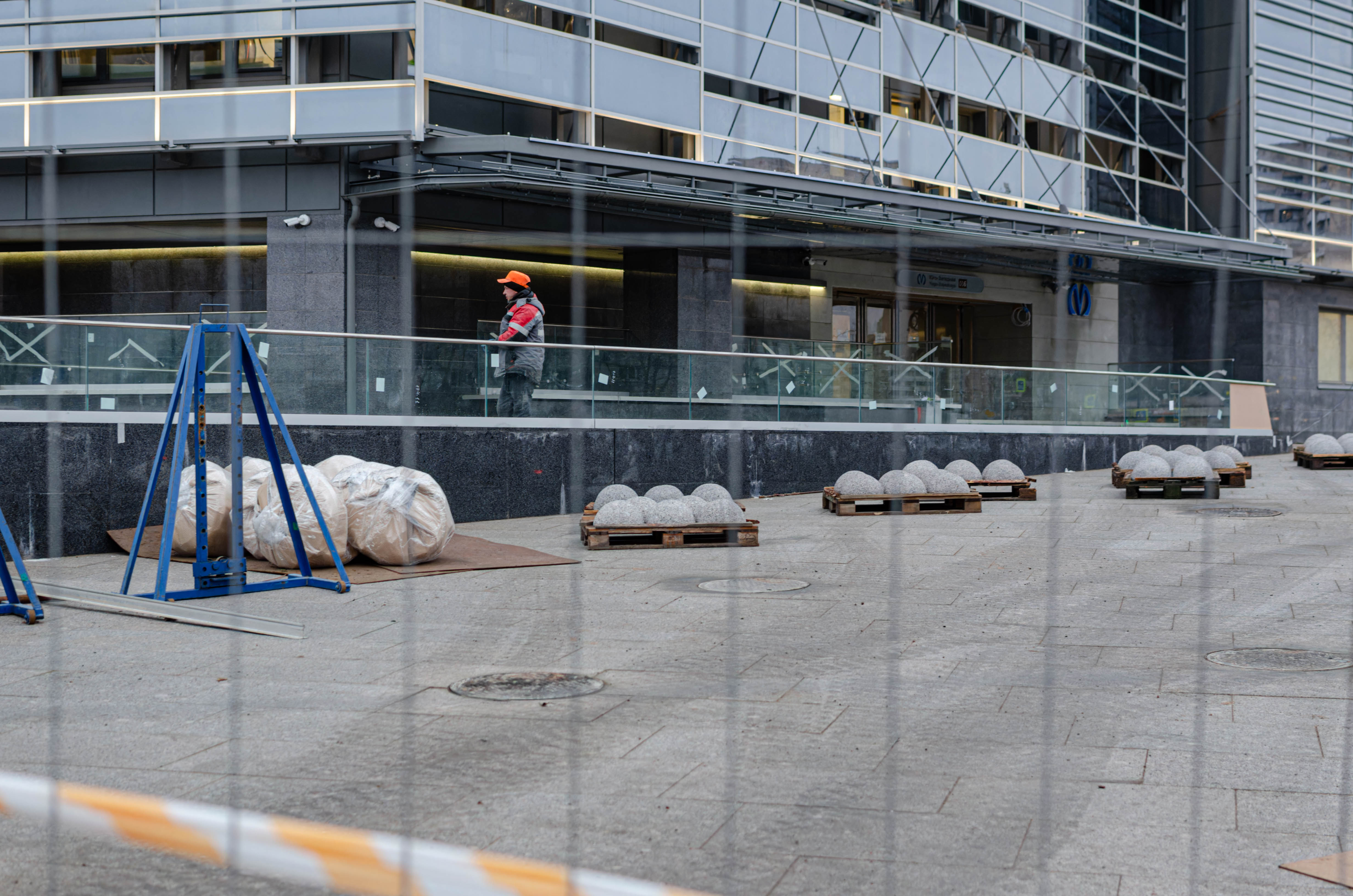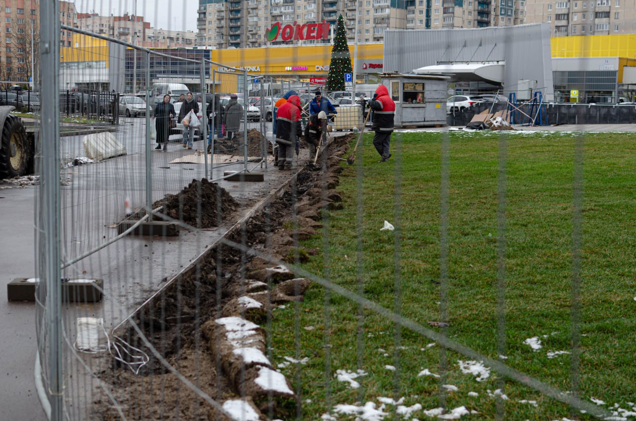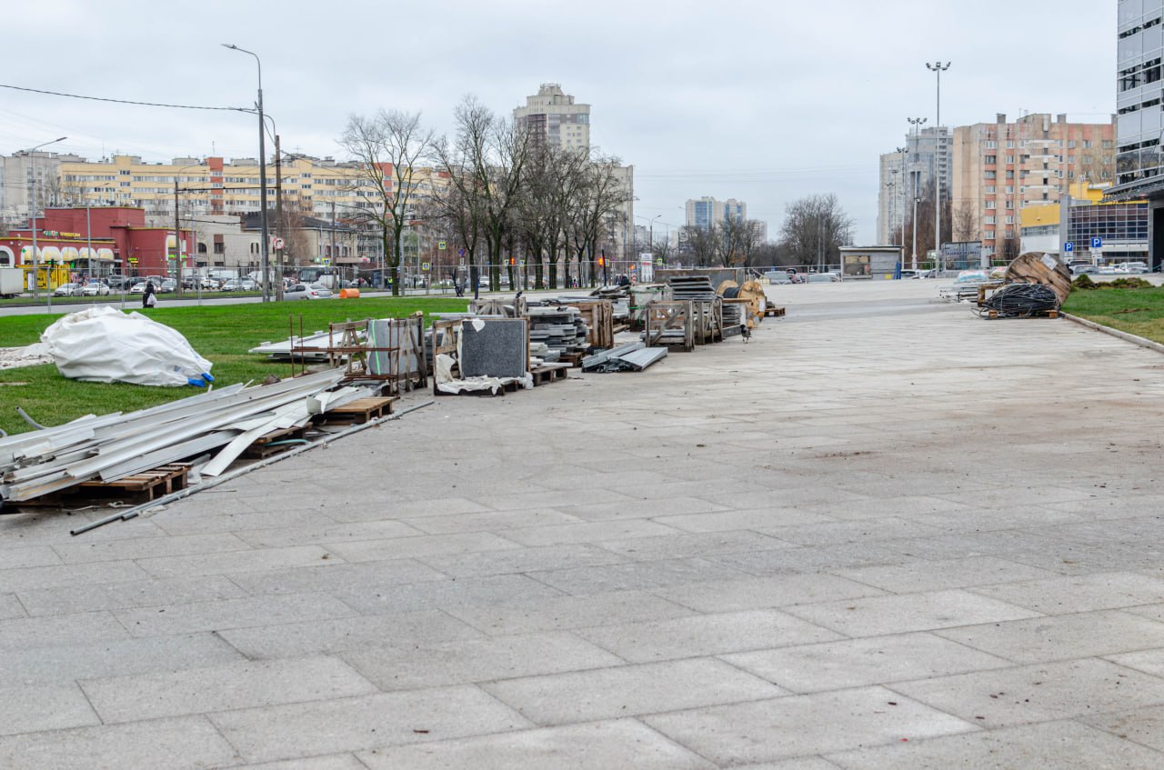 Завершают установку стеклянных ограждений, поставили гранитные поребрики, разделяющие газон и тротуар для предотвращения размыва, завезли каменные полусферы