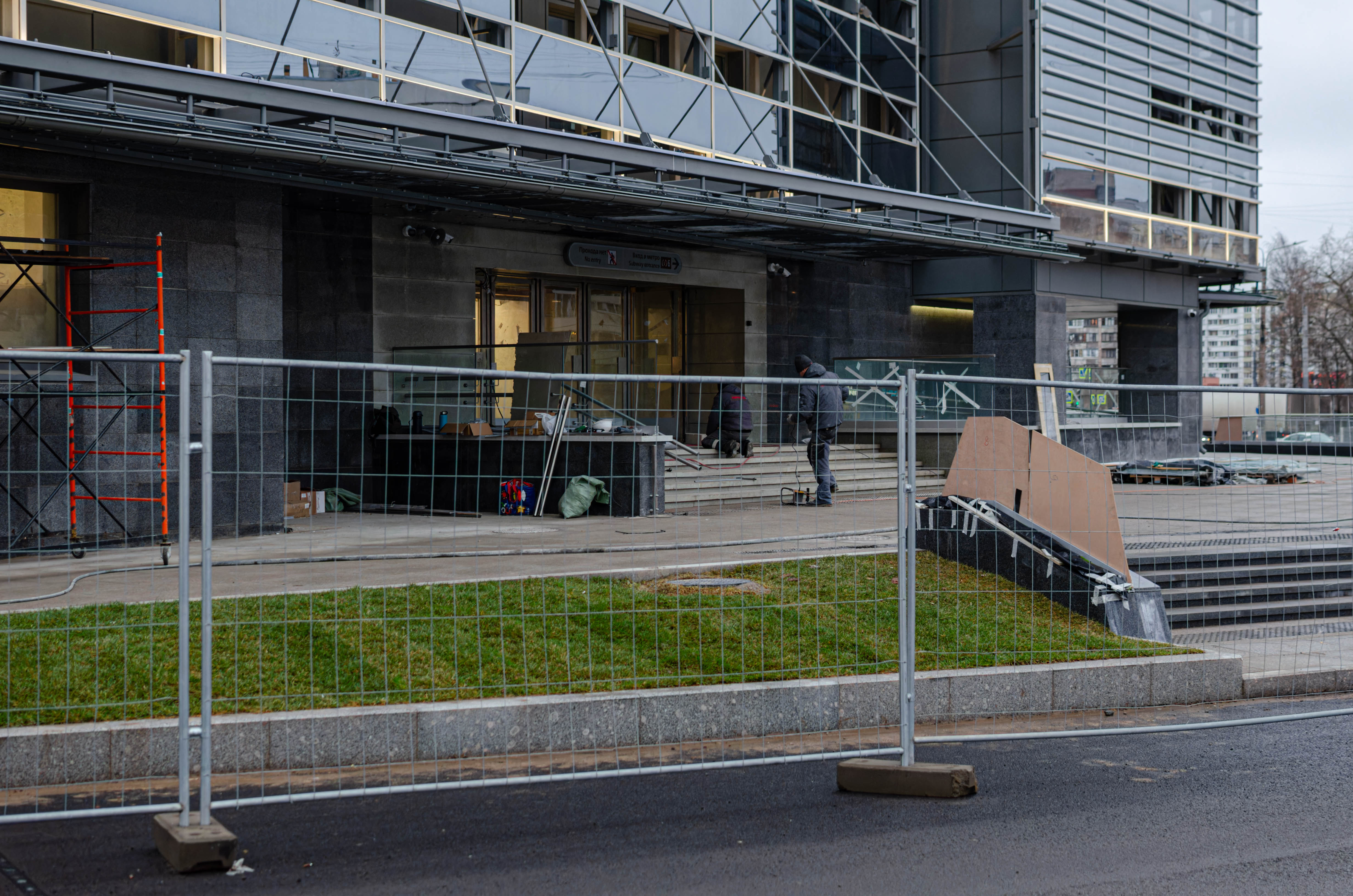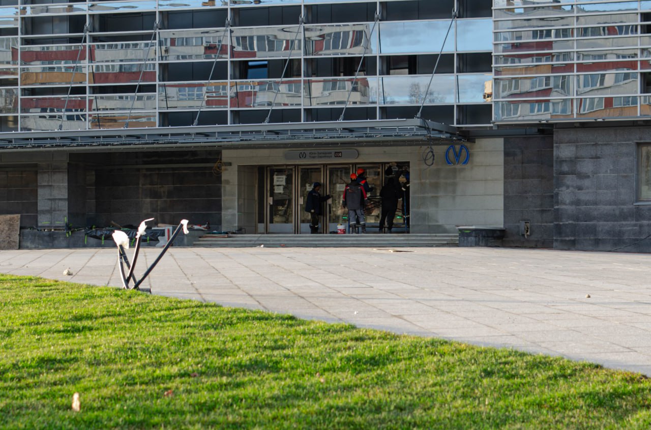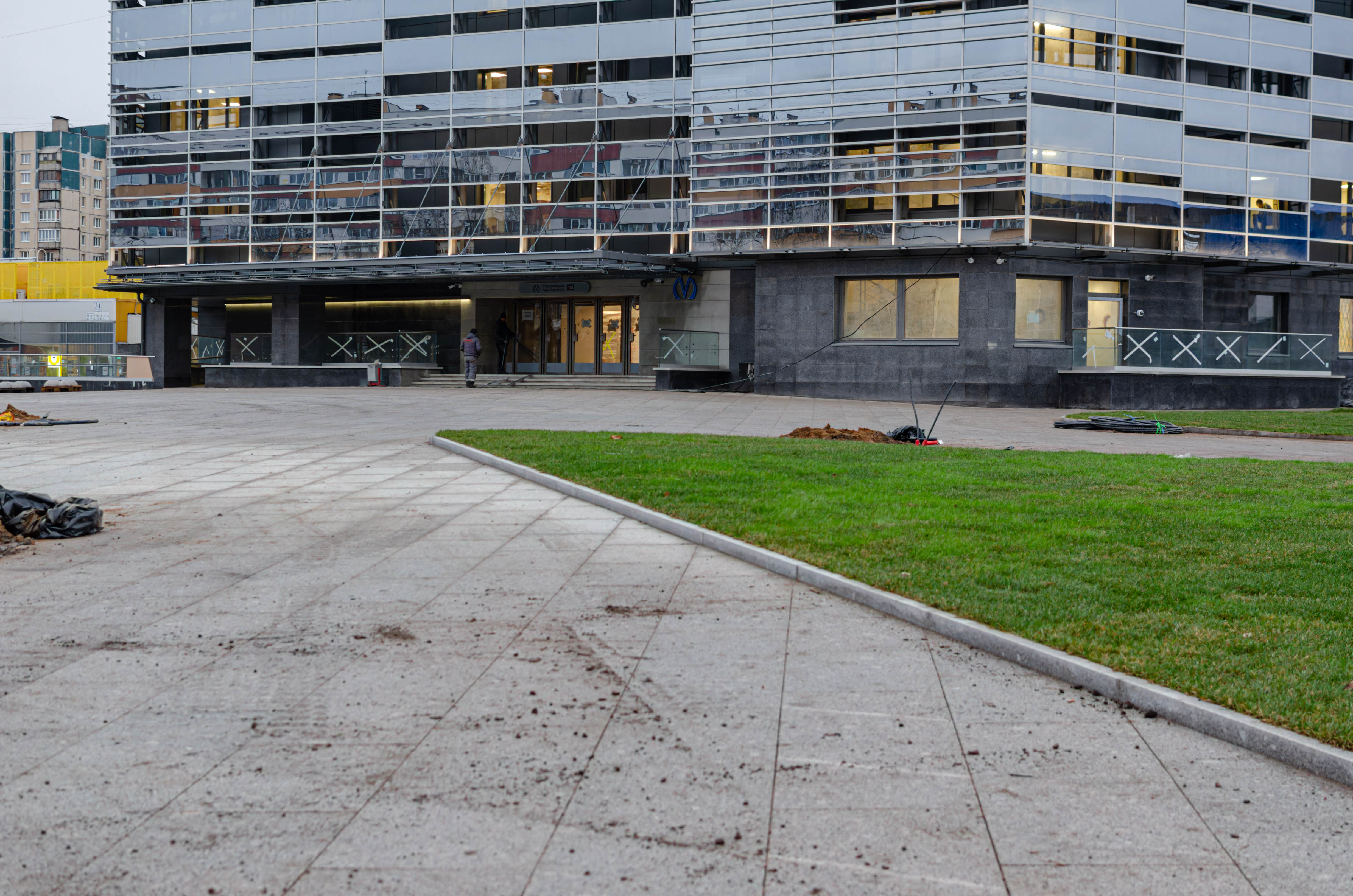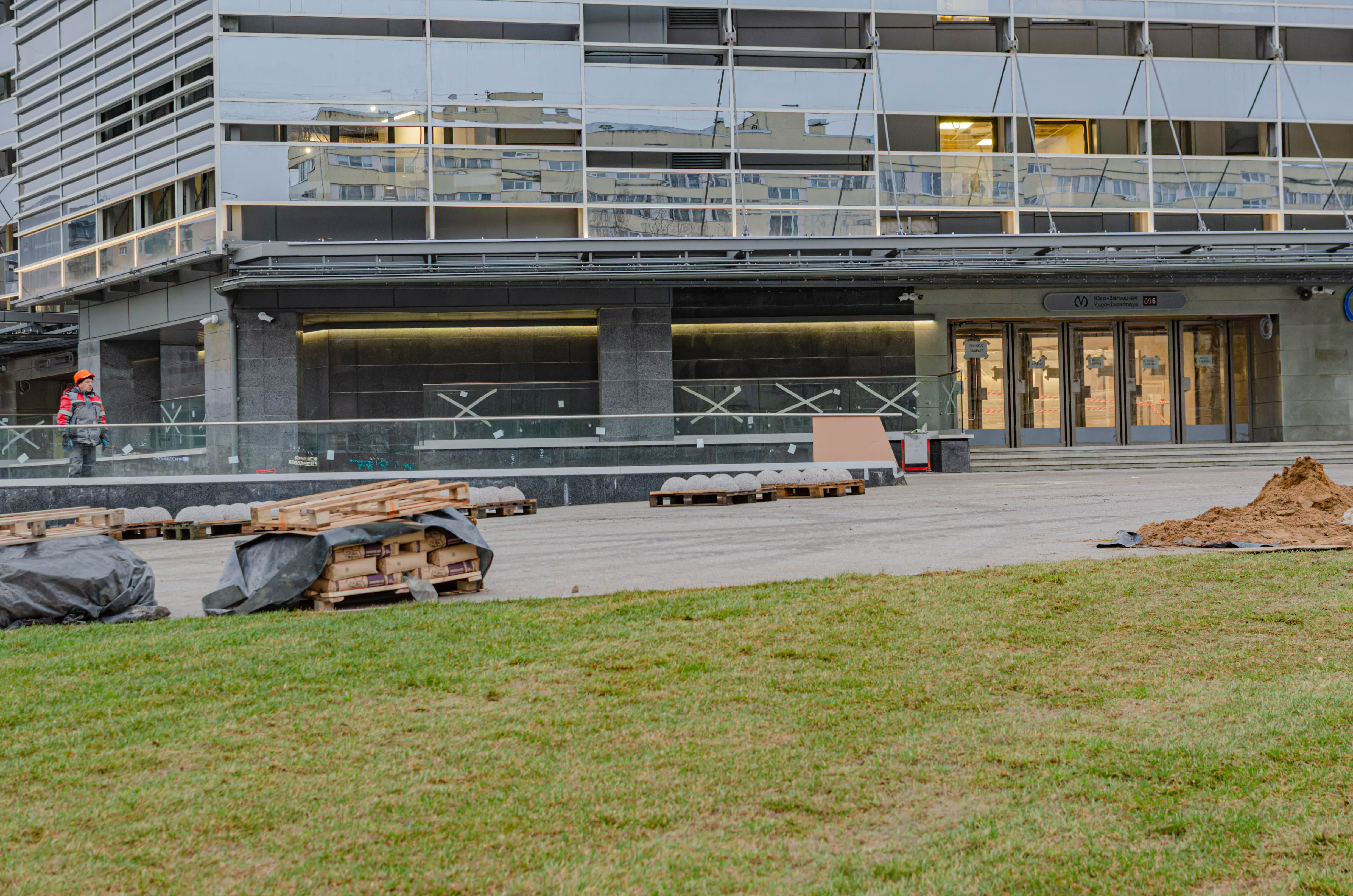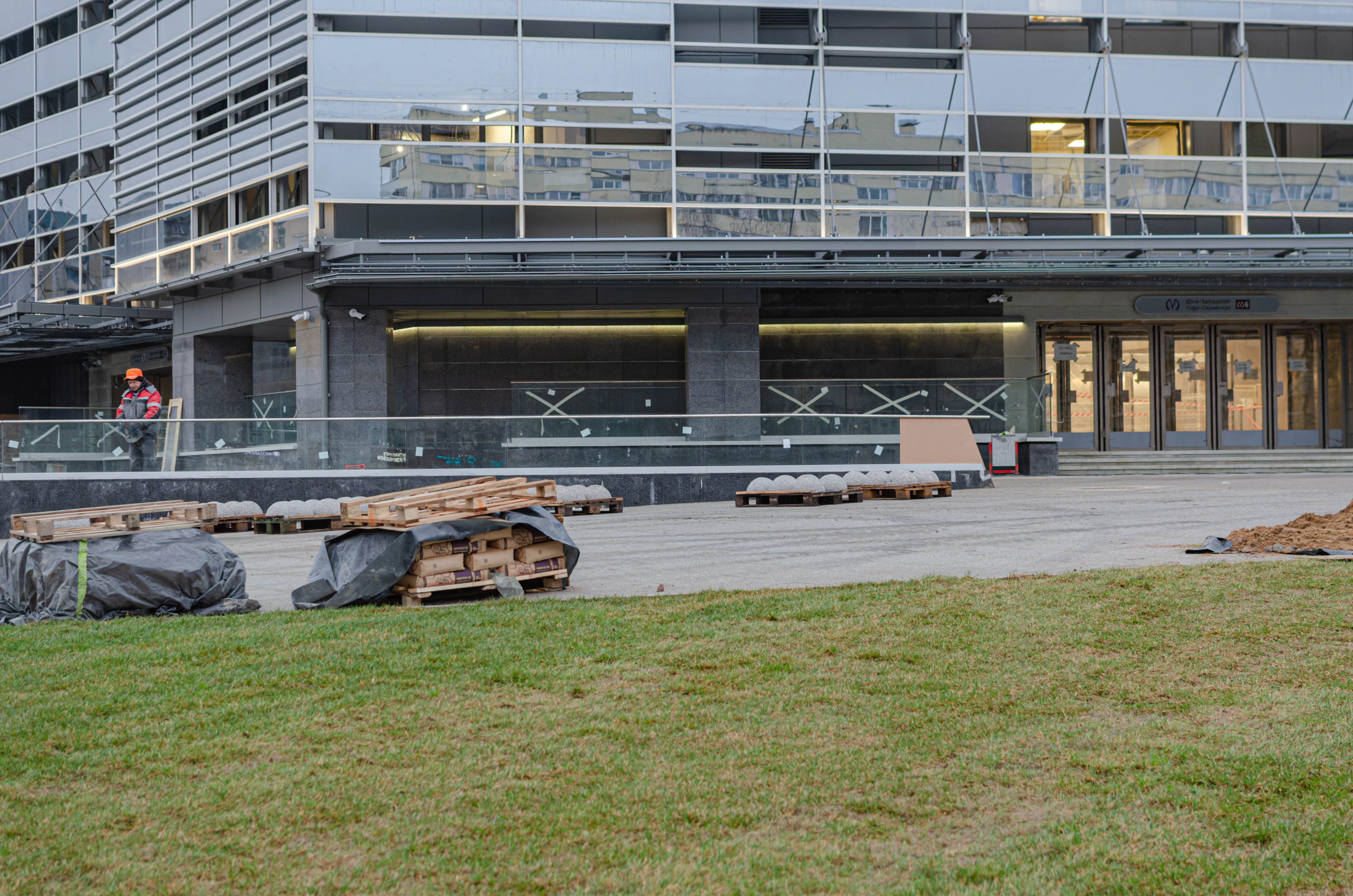 Актуальное состояние вестибюля станции Юго-западная. Там, где отсутствует поребрик между асфальтом и газоном, как вижу, начали выкапывать под него место. Ну и...всё