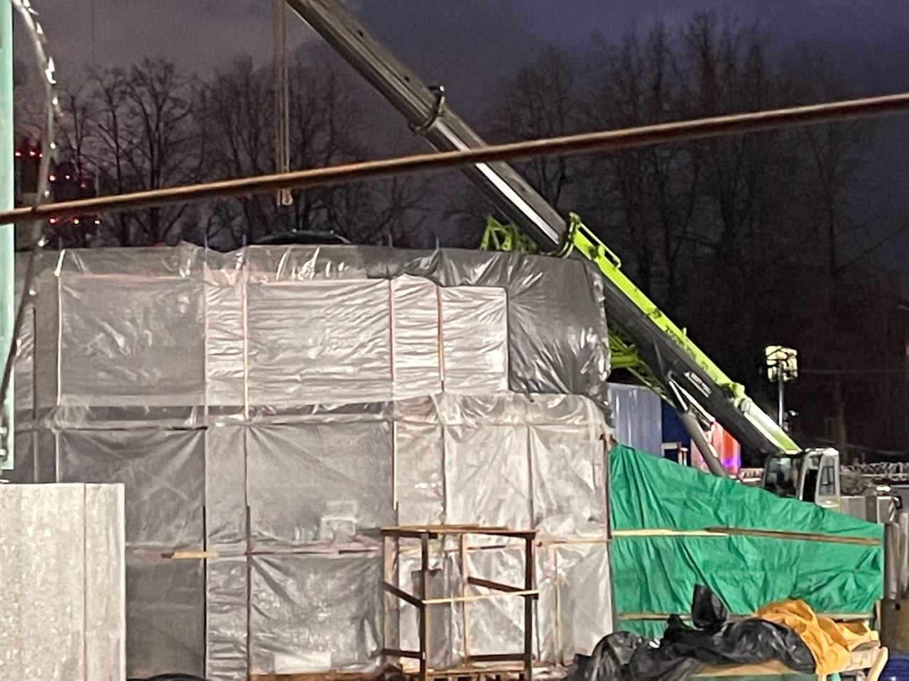Начинается монтаж вентиляционного киоска из металлических решёток, которые придадут этому сооружению узнаваемый вид.