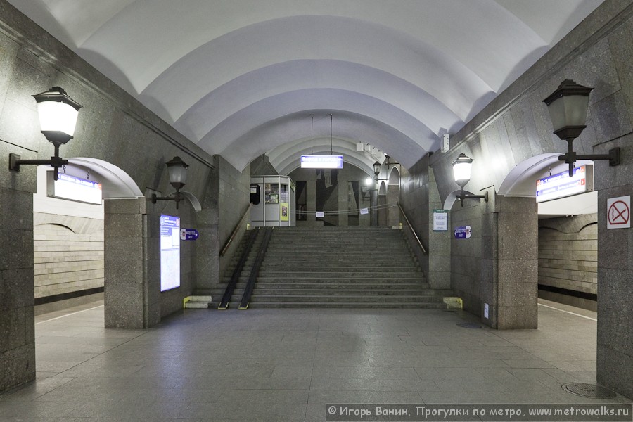 Типичный проект оформления станций. Мрамор, мозаика в торце и вестибюле. Третья одинаковая станция на ФПЛ.
