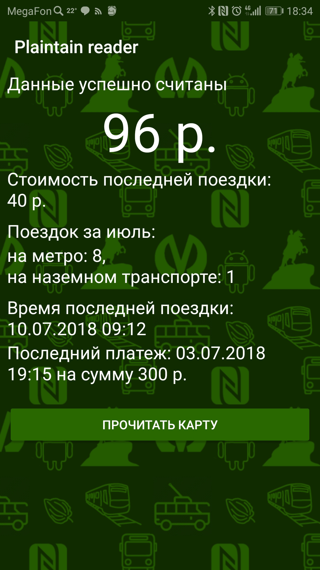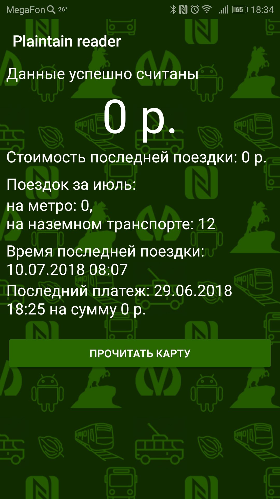Кстати, нашёл удобное приложение для смартфона с NFC, которое умеет считывать некоторую инфу с Подорожника. Если у вас на Подорожнике электронный кошелёк, то приложение покажет сколько денег есть на карте, когда, сколько и на каком виде транспорта были последние поездки, когда последний раз списывались деньги с карты и когда последний раз пополнялся баланс кошелька. Особенно полезно узнать сколько списали с карты в маршрутке, например. Но с суточными/едиными проездными билетами ситуация в приложении гораздо хуже — считывается далеко не всё...