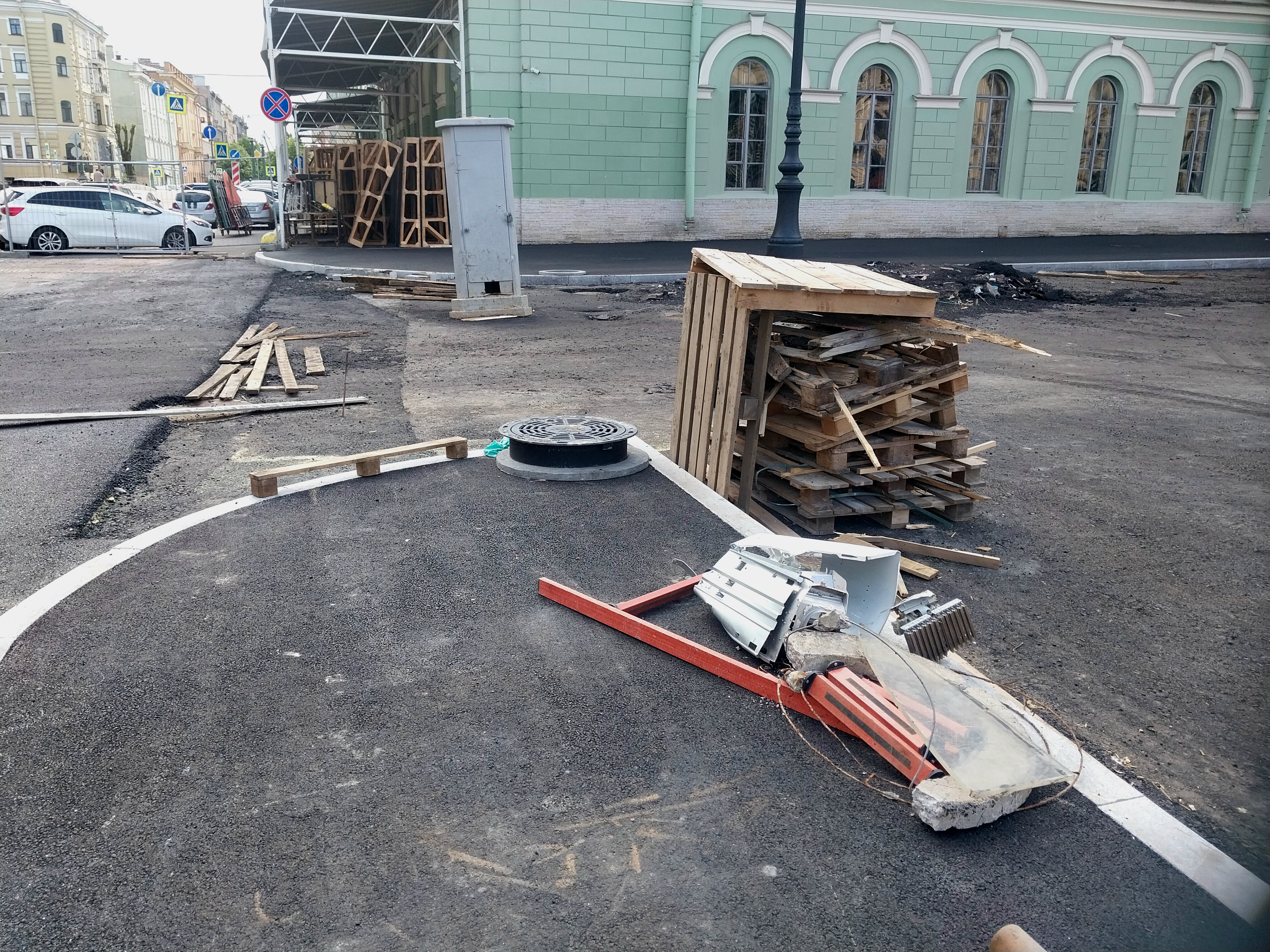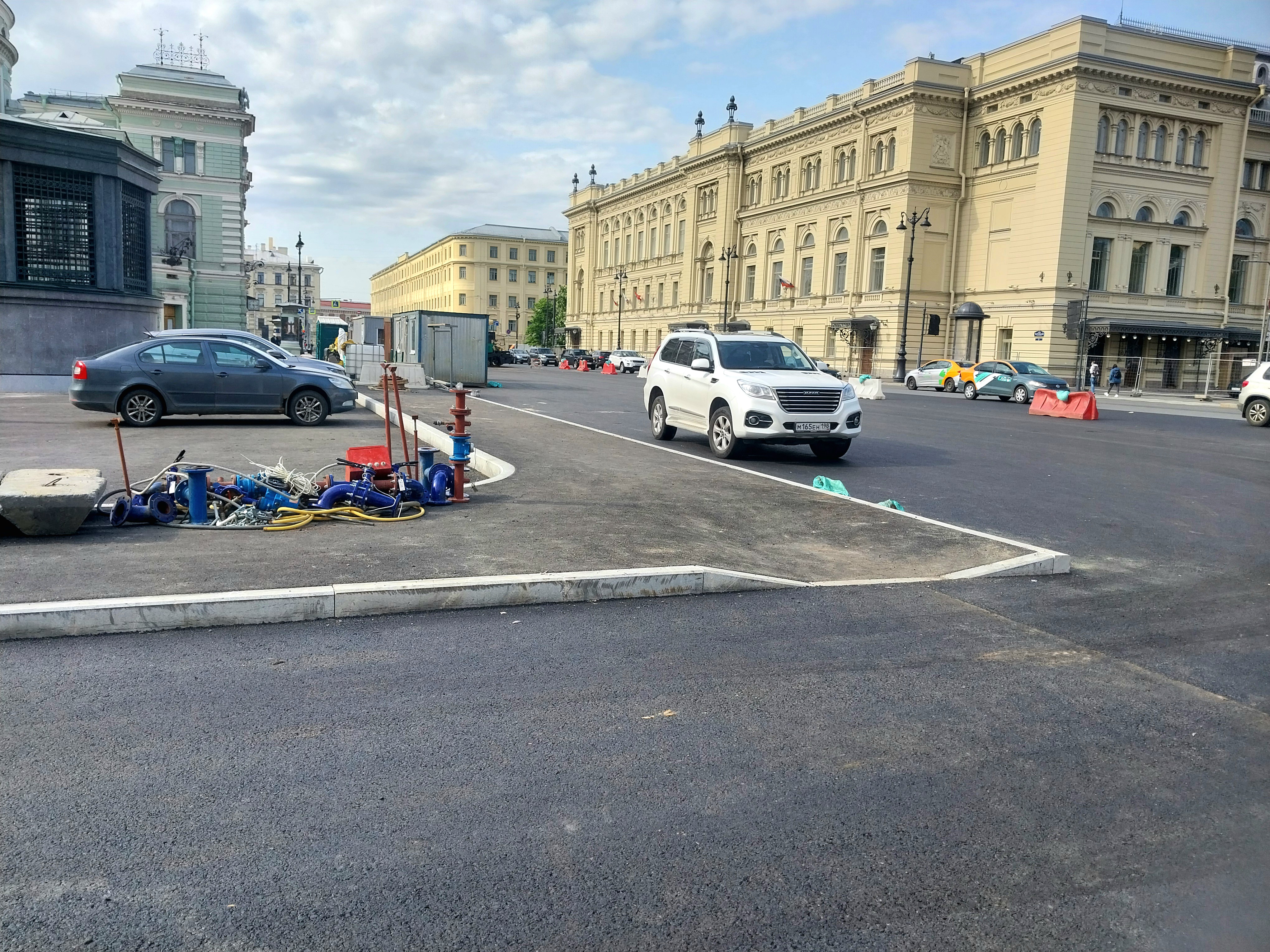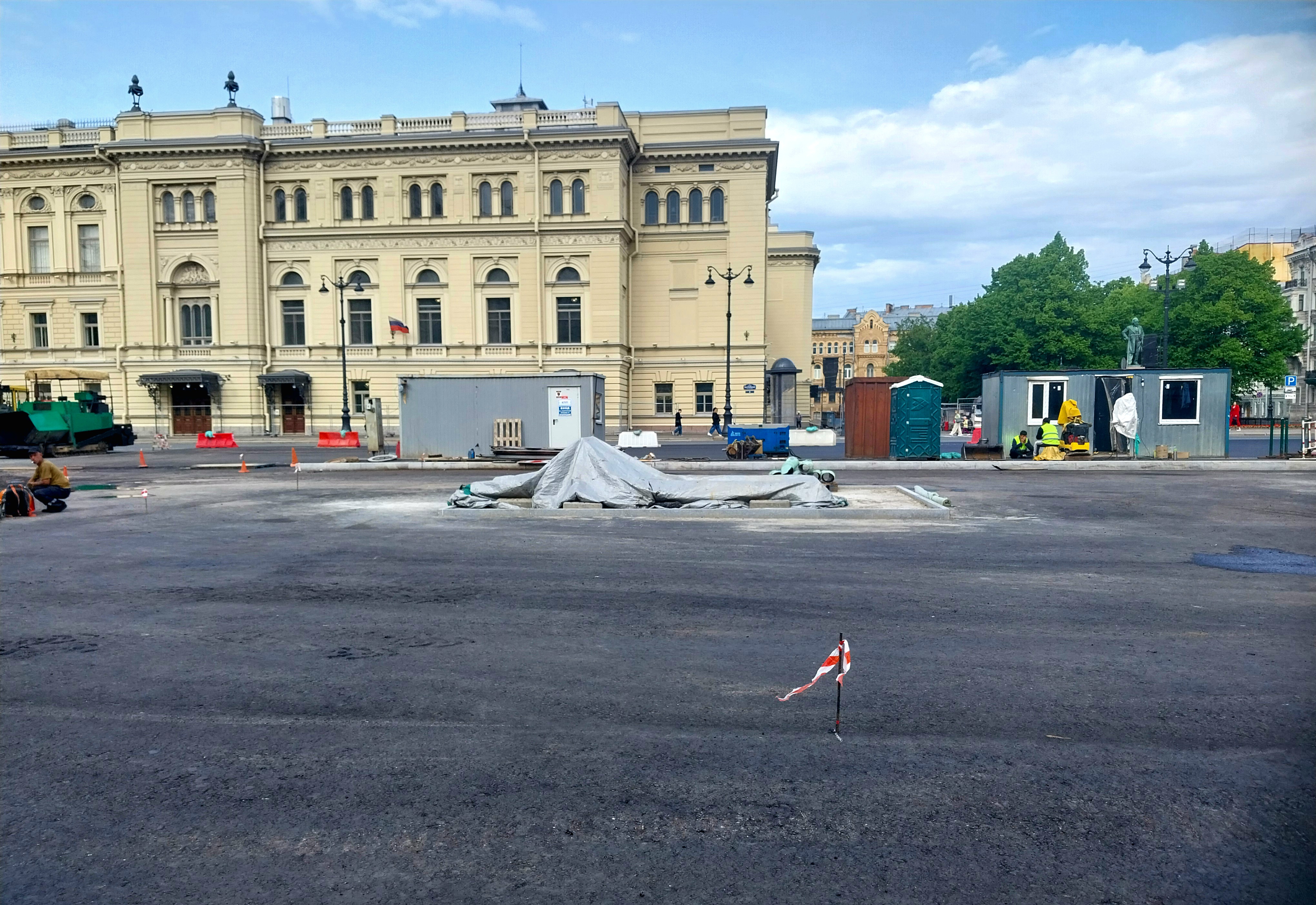 Сегодня залили асфальтовое покрытие со стороны пешеходной зоны у здания Мариинского театра. Асфальт на данную минуту ещё свежий, от него отдаёт характерным теплом и ваша обувь будет к нему немного прилипать.