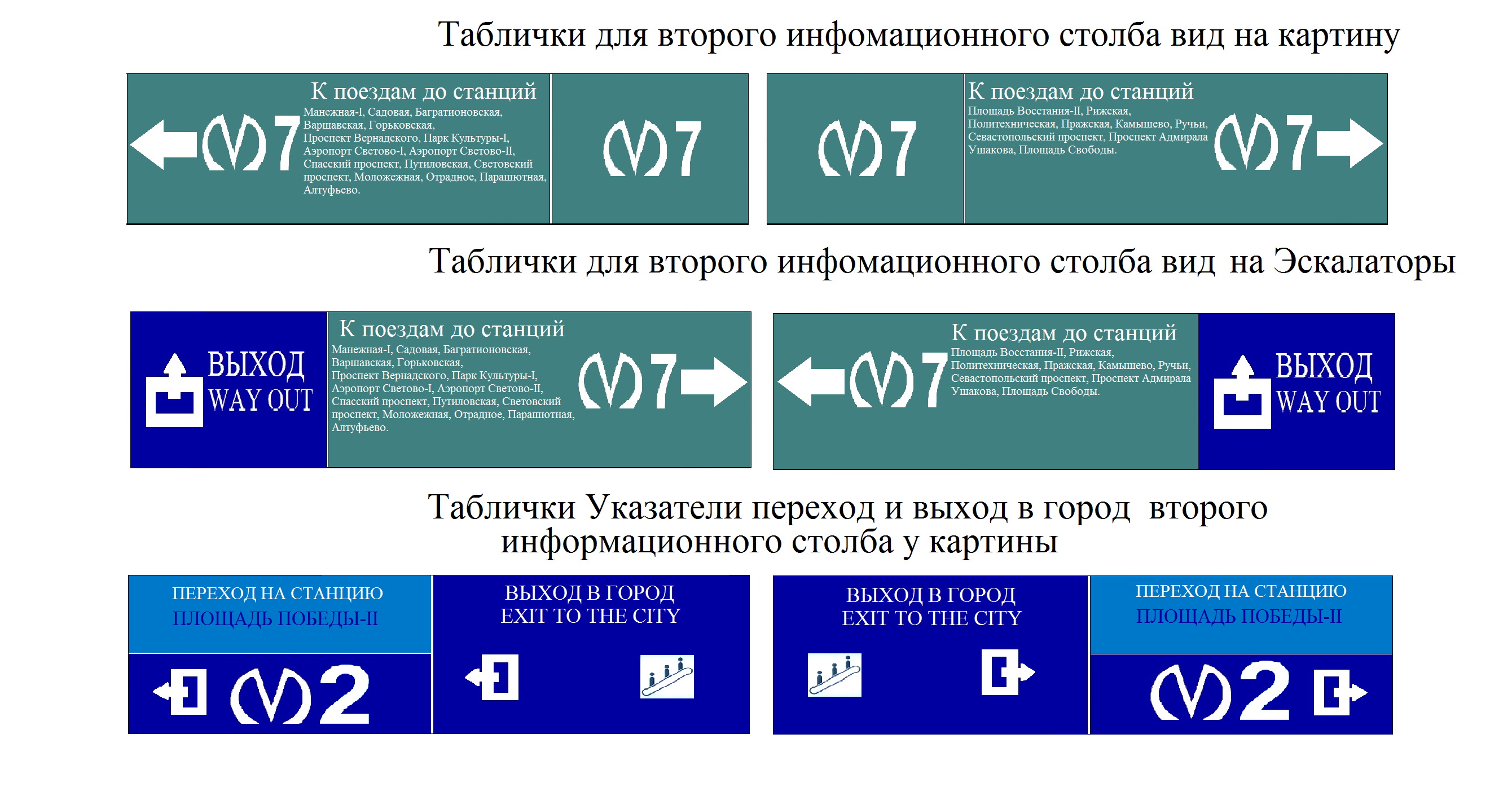 Что касается входа на станцию, то навигация по конечным дает более быстрое ориентирование, да, нужно заранее определиться с тем, в какую сторону нужная тебе станция, зато потом гораздо проще, только я бы сделал лайтбоксы конечных с белым фоном и только логотип линии в цвет, а под текстом внизу меньшим размером номера линий пересадки в этом направлении (если таковые есть), т.е. спускаясь на Сенной и зная, что тебе нужно пересесть на зеленую линию ты видишь указатели с одной стороны М2 Купчино и мелко внизу красный логотип М1, а с другой М2 Парнас и ниже аналогично зеленый м3 то интуитивно можно понять - в какую сторону на зеленую поворачивать и не тупить при выходе с эскалатора, что касается схем на путевой стене, то там достаточно лишь списка станций линии и опять же указания линий пересадки, т.е. так, как и есть сейчас, в принципе.