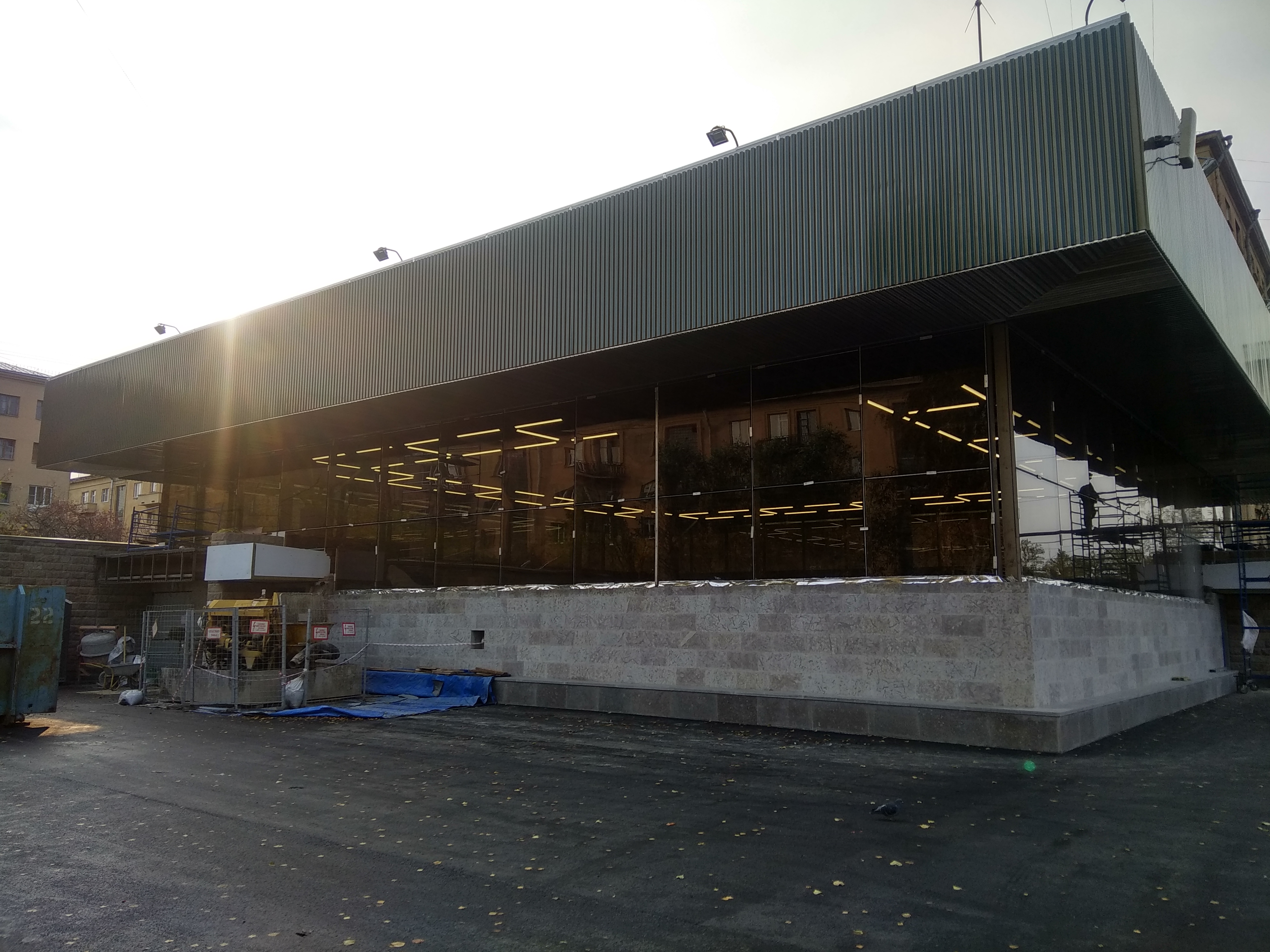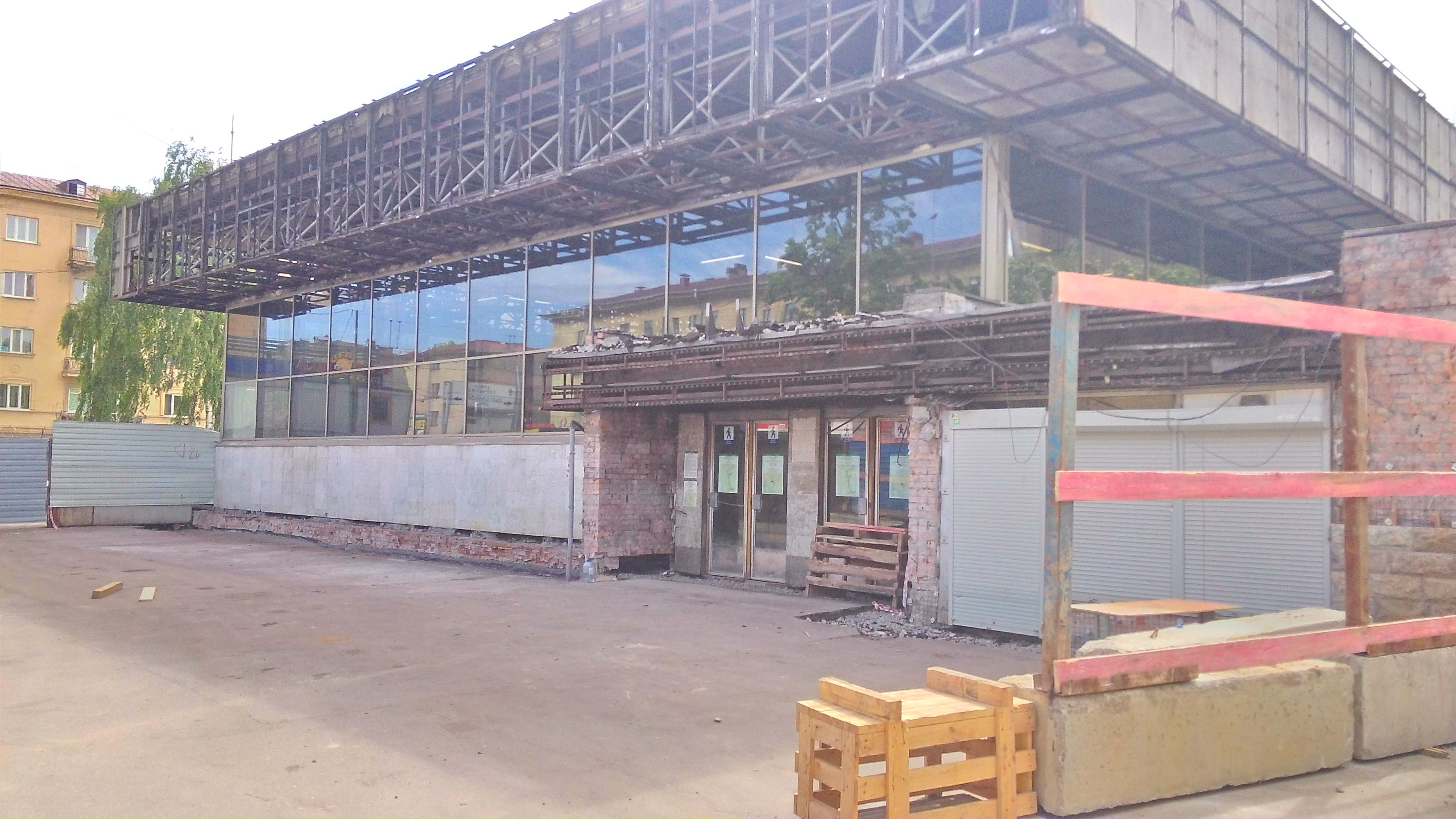 Территория большей частью огорожена, облицовка вестибюля в правой стороне содрана
