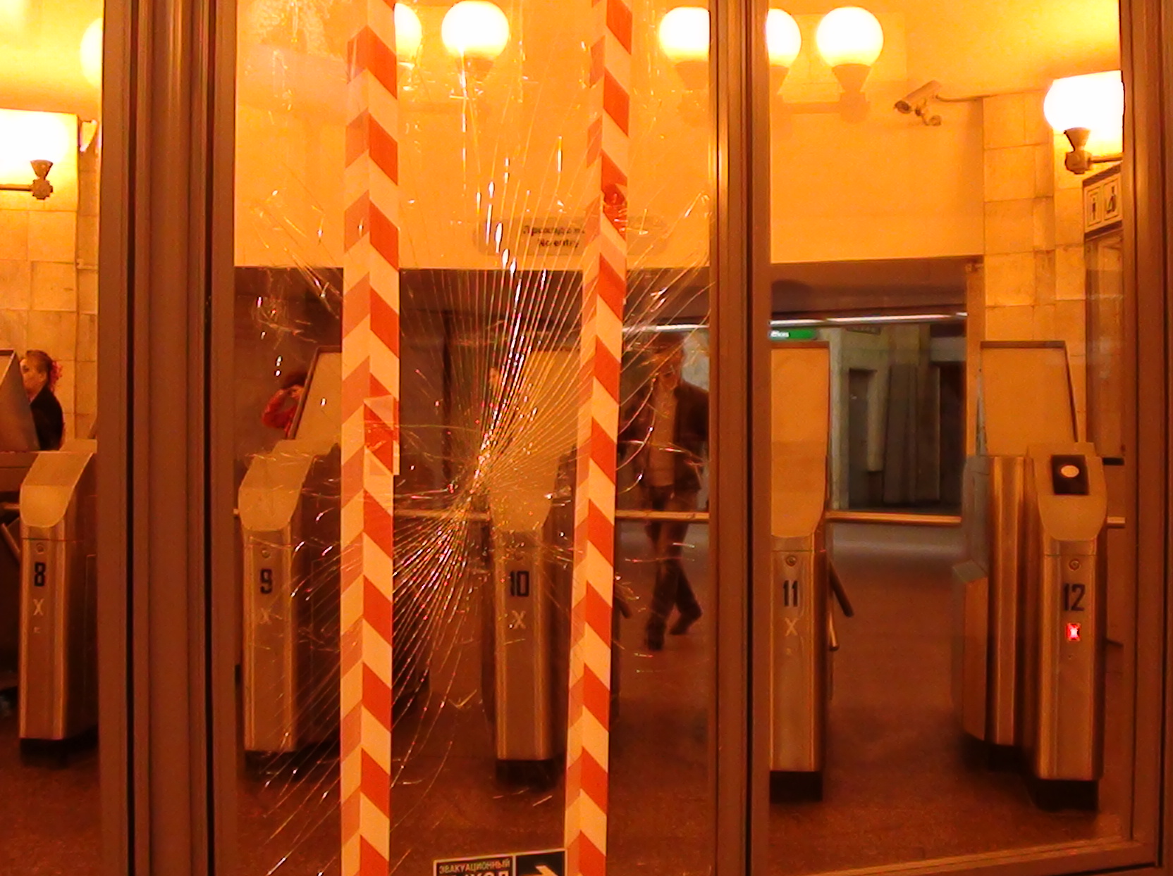 Кто-то от ярости разбил блокирующую стену из стекло-металлических блоков. Не так давно была в трещинах только правая. Сегодня заметил, что и левая теперь в трещинах.