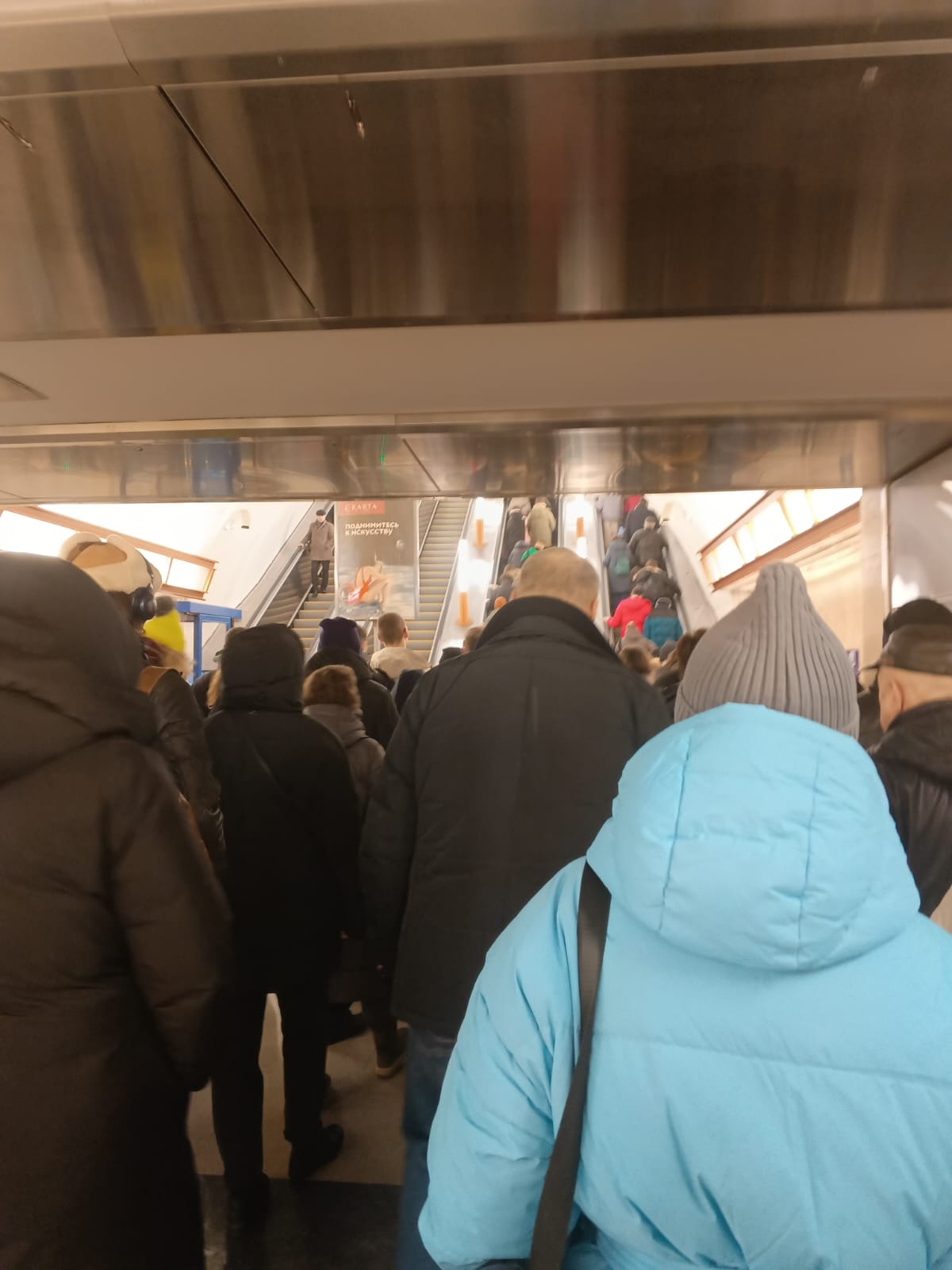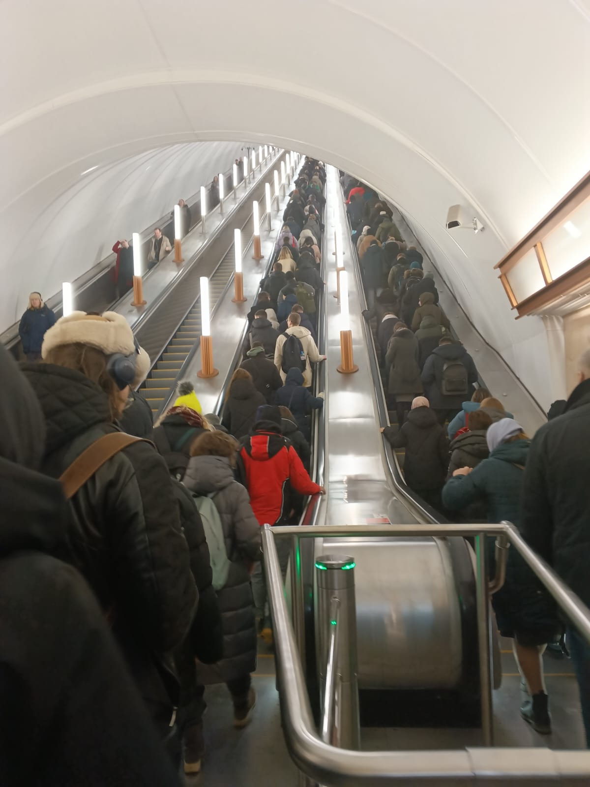 Фото сделано в четверг в 8,35. Два эскалатора, работающие на подъем, достаточно загружены, люди, в основном, стоят по двое. Перед эскалаторами небольшая очередь.
