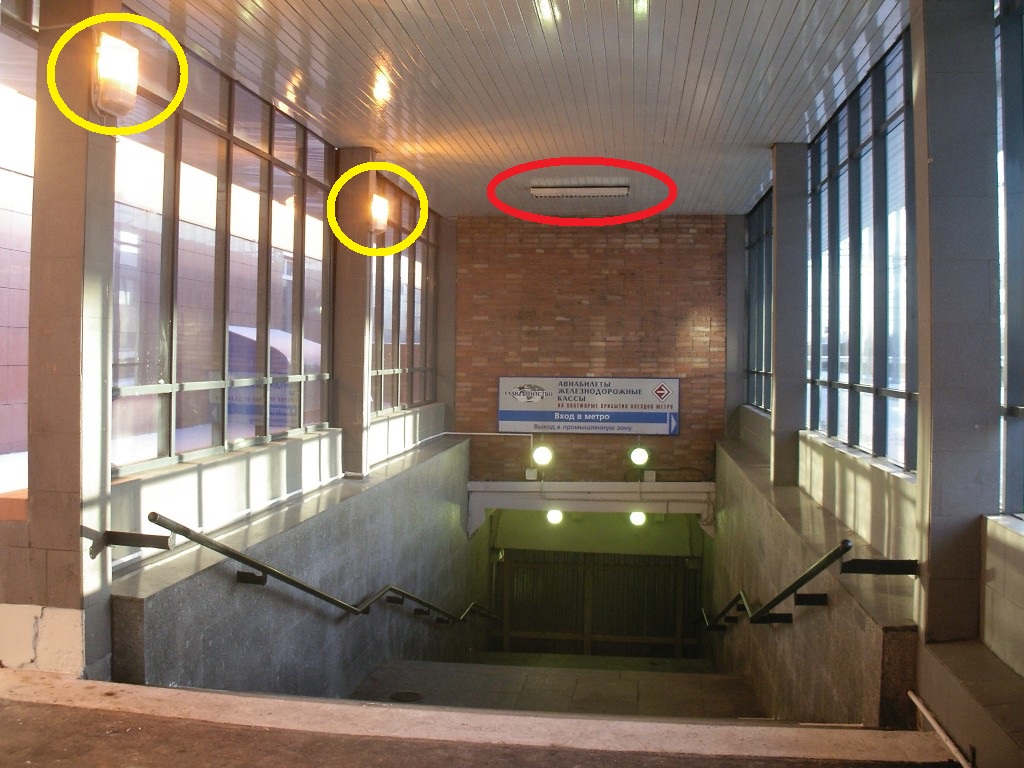 В каждом из входов висит древняя люминесцентная лампа (одна на павильон). Отмечена красным. Работающей я её никогда не видел. Да и олка бы от неё не было.