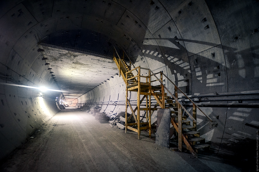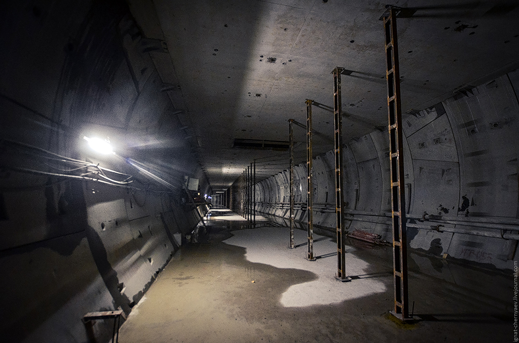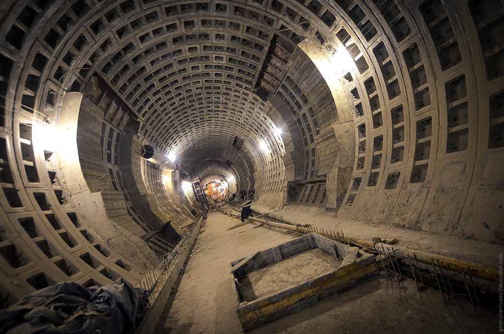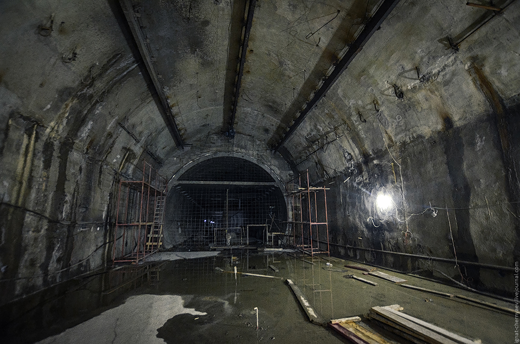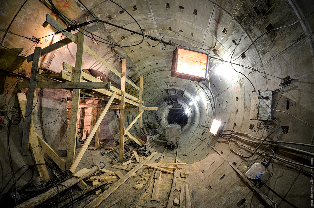 3. Правый перегонный тоннель между станцией и демонтажной камерой, где продолжается сооружение камер гермозатворов и обводных ходков: