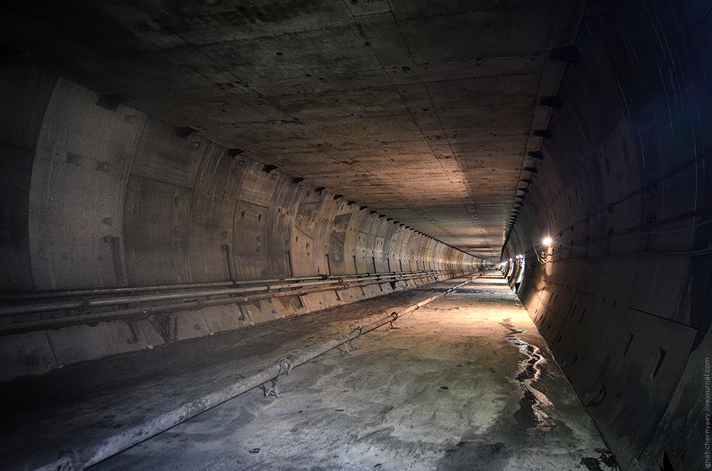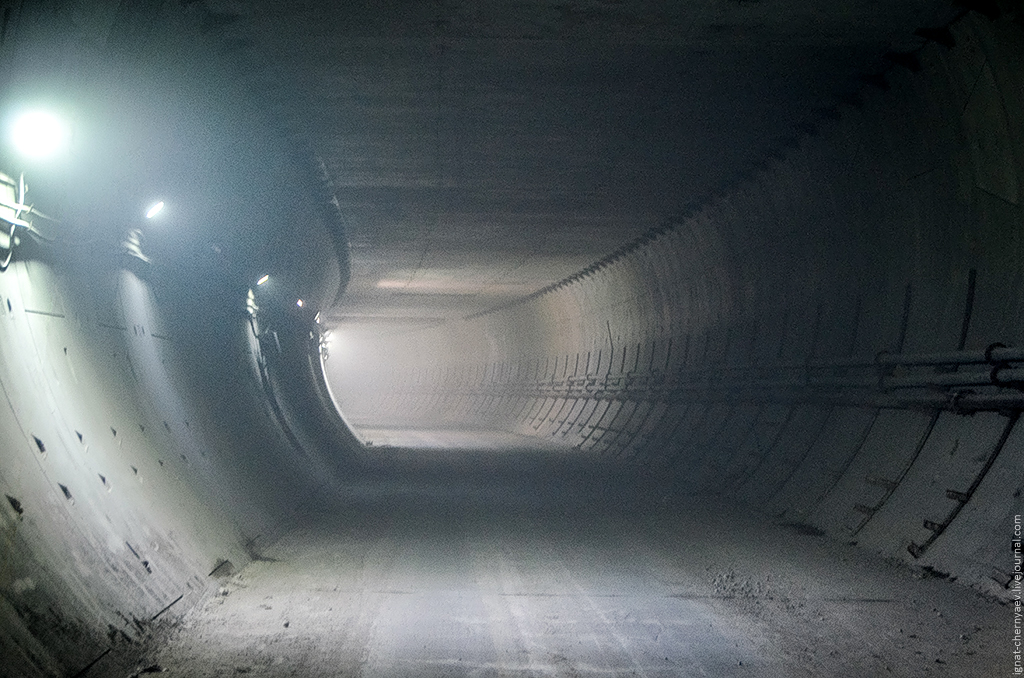 7. Двухпутный тоннель в сторону 625-й шахты, тут уже полностью готов вентканал и установлены стойки под кабеля:
